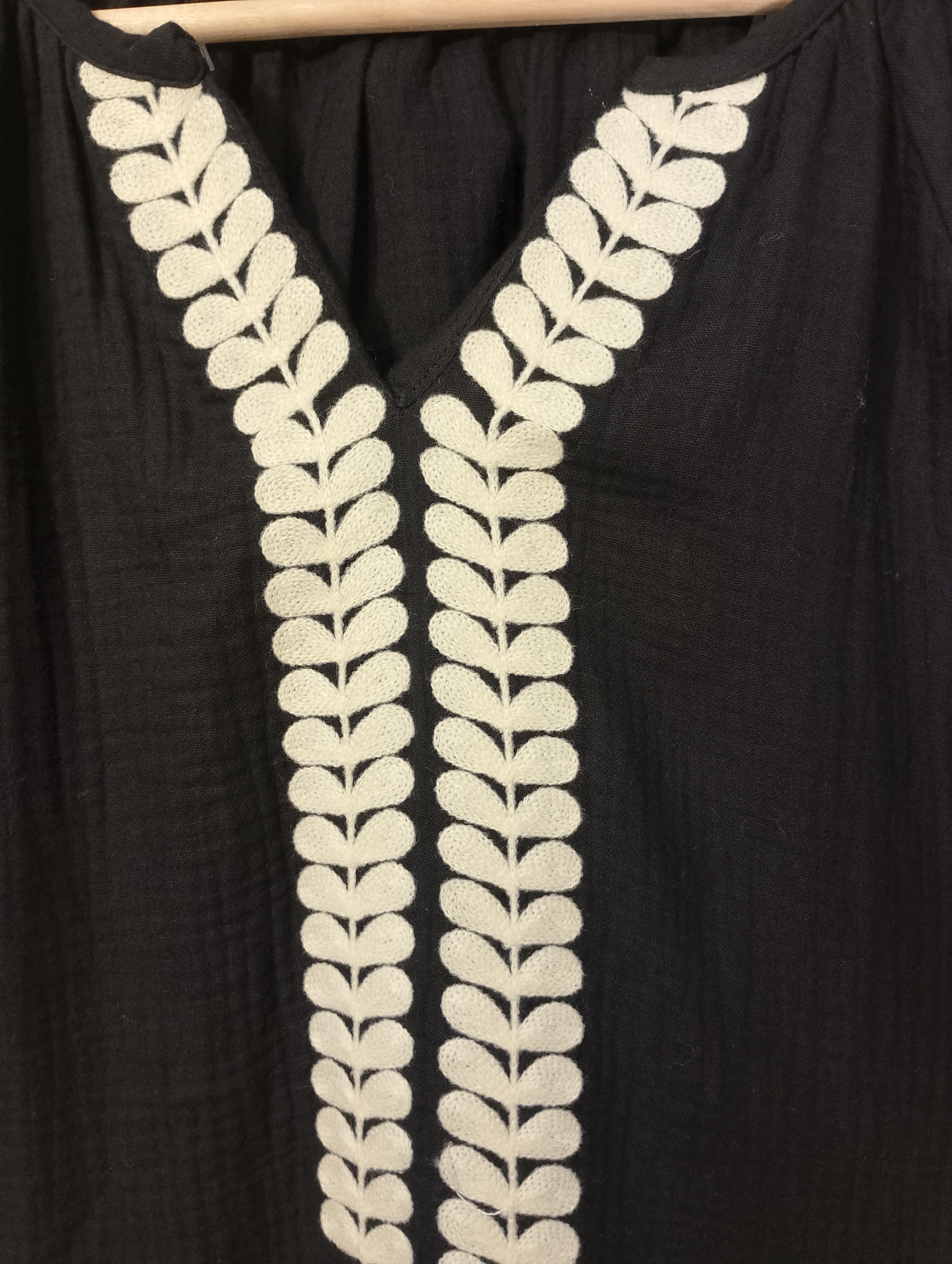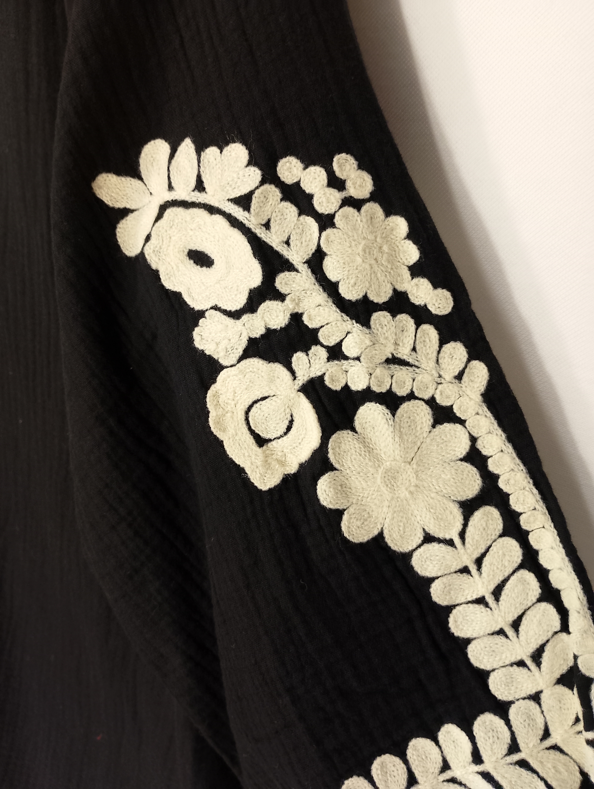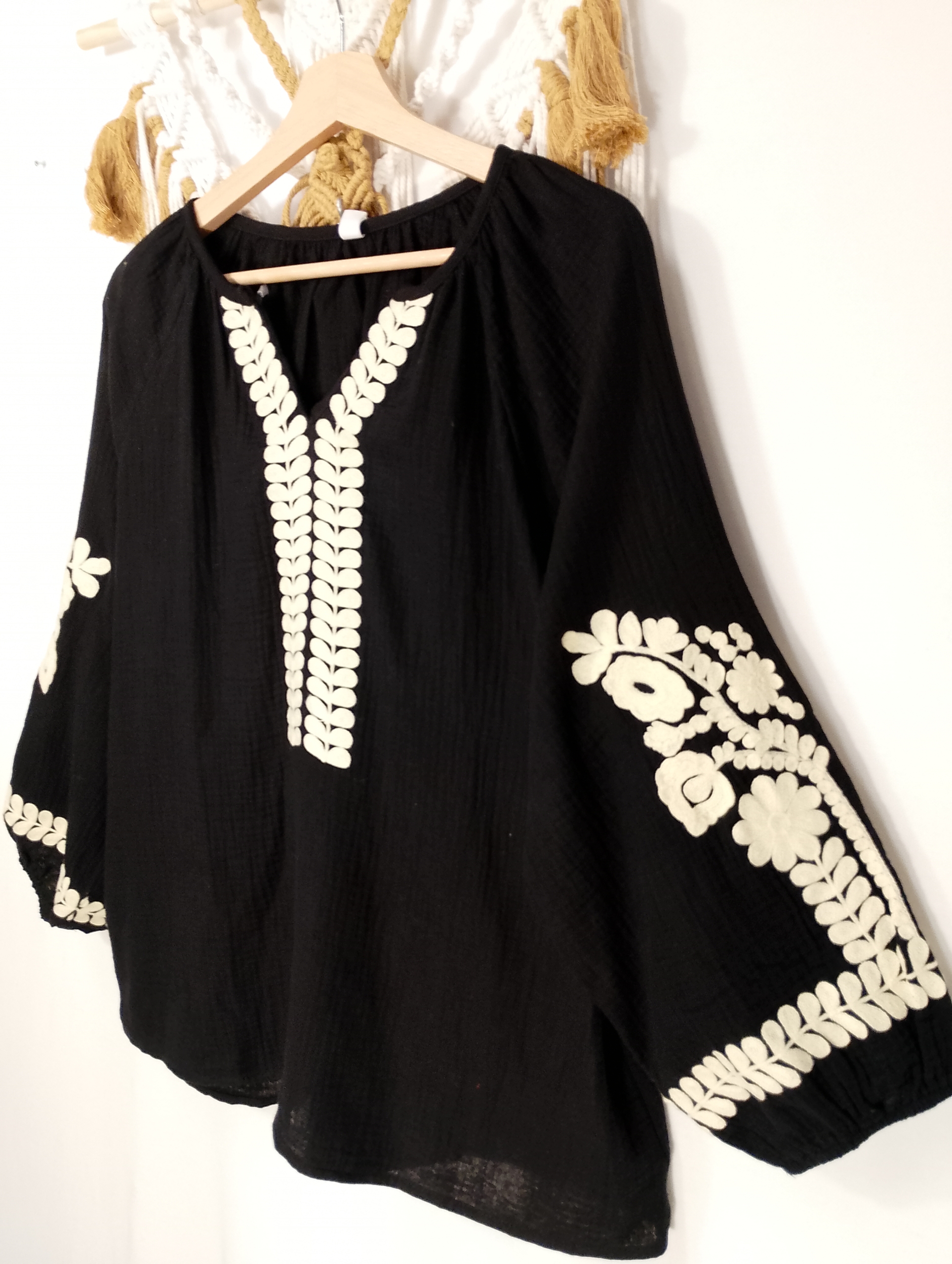Blusa 100% algodón en color negro con delicados bordados en tono crema. Su diseño artesanal combina elegancia y un toque bohemio ideal para cualquier ocasión. Amplia, cómoda y femenina, disponible en tallas S, M y L oversize.