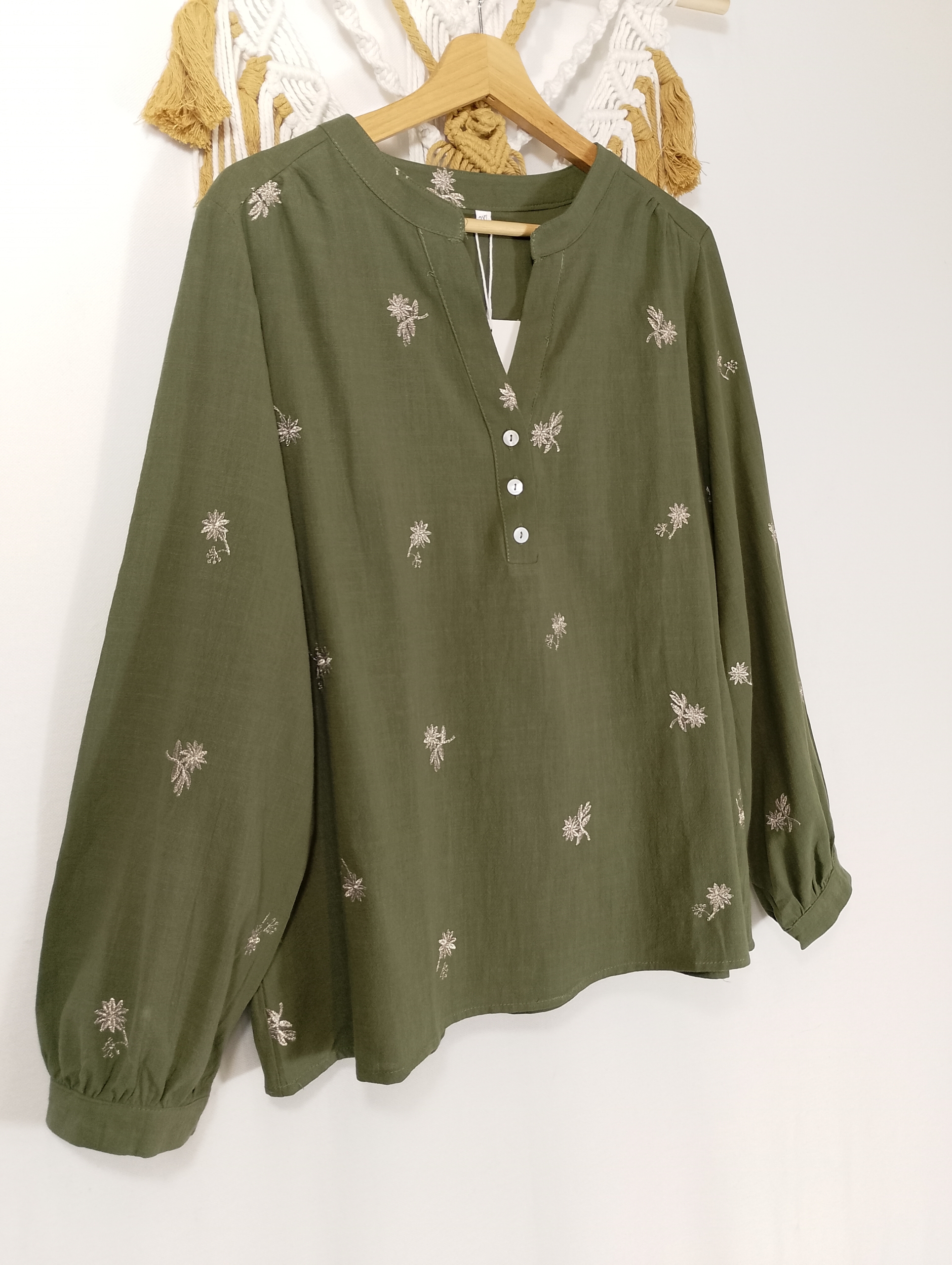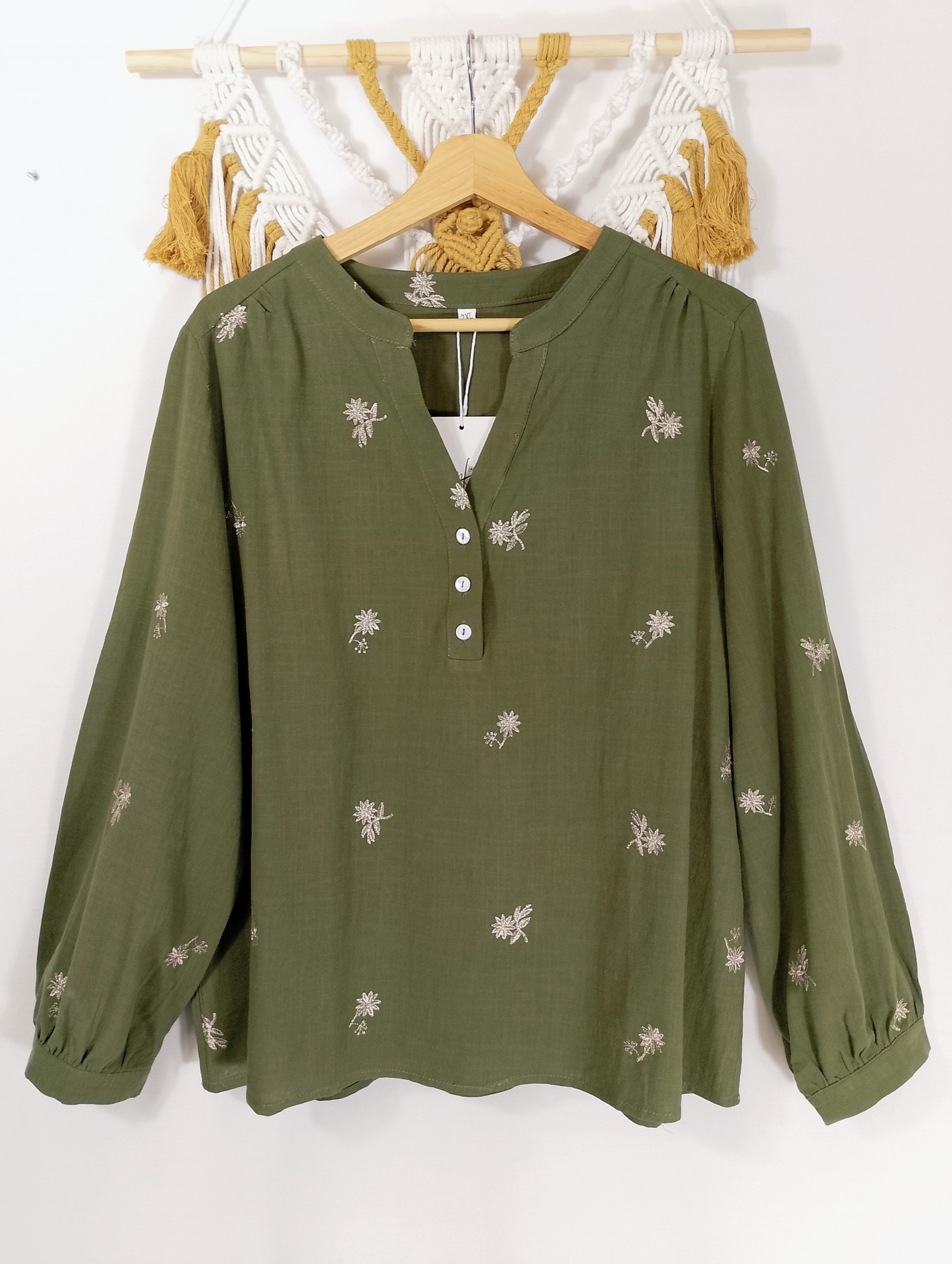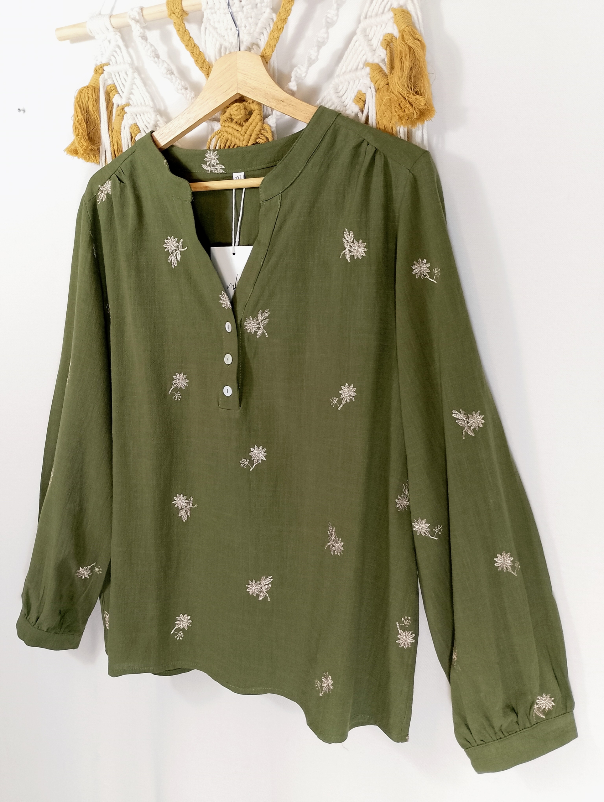 Blusa 100% algodón de color verde oliva con delicados bordados florales en tono natural. Su tejido ligero y su diseño artesanal aportan frescura, comodidad y un estilo femenino y natural. Disponible en tallas L y XXL