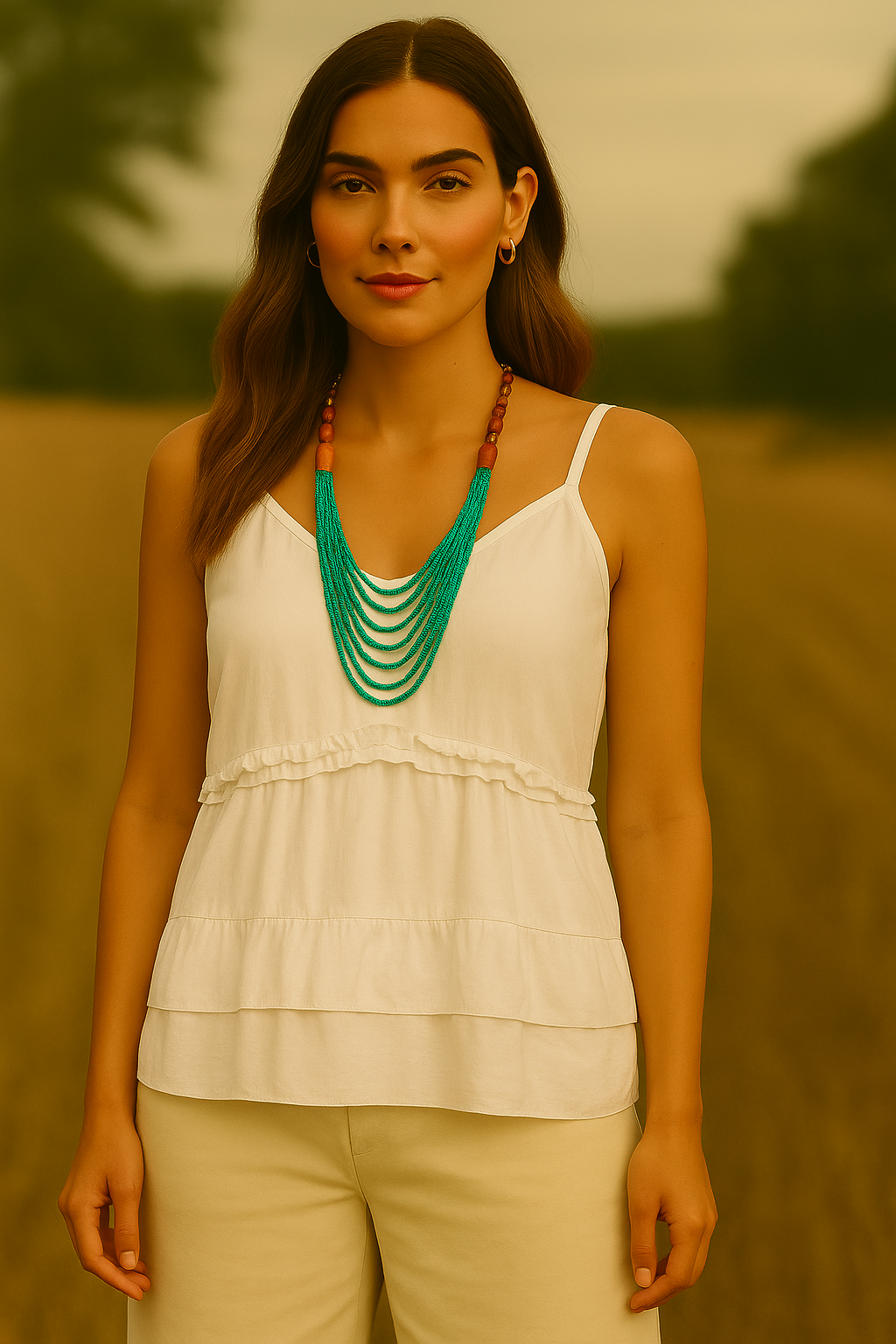 Además, los tirantes ajustables permiten un ajuste cómodo, mientras que los volantes añaden movimiento y feminidad. Por eso, esta blusa ibicenca es perfecta tanto para un look diario como para una noche veraniega con estilo boho chic.