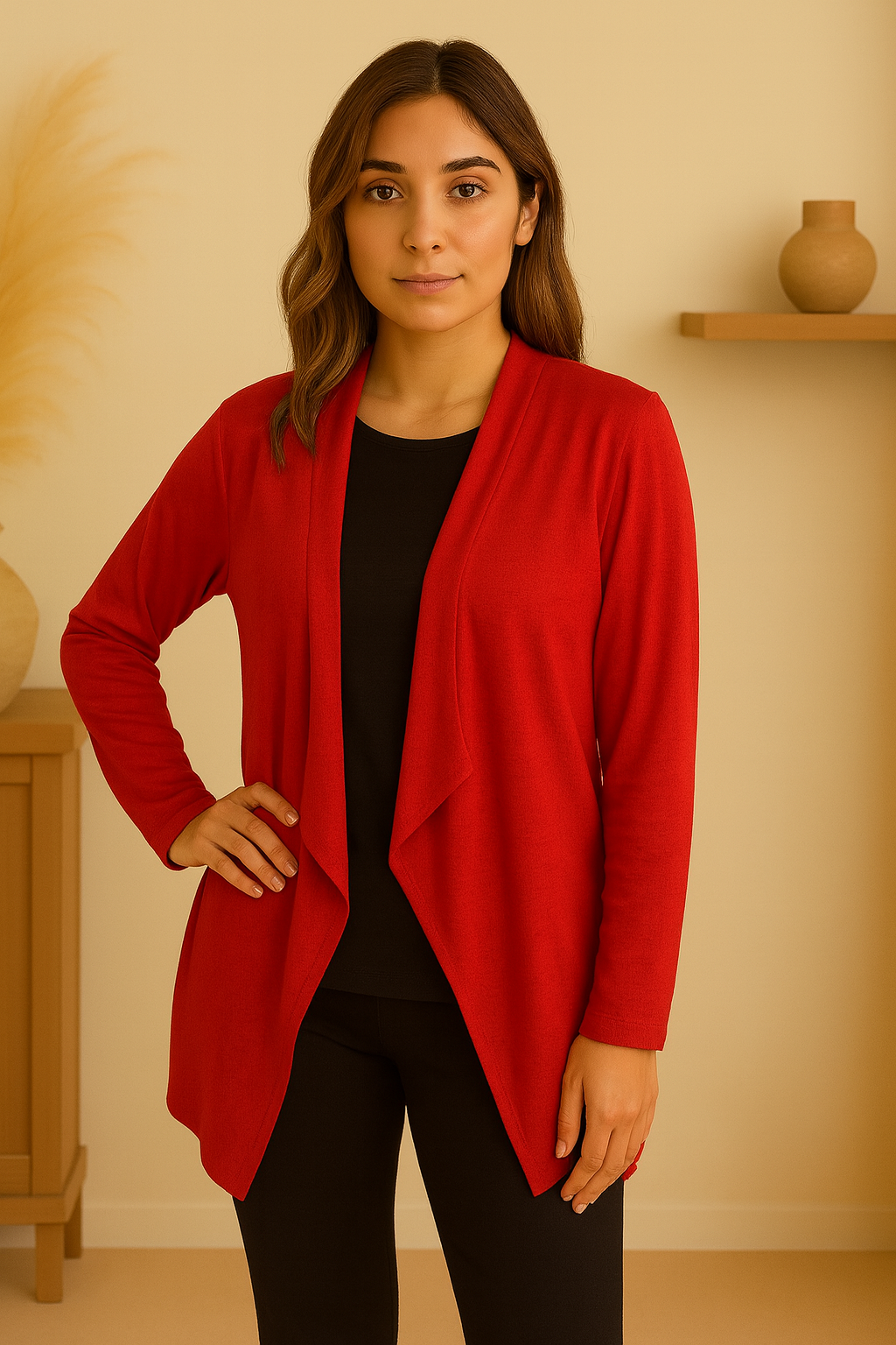 Confeccionada en un tejido de alta calidad con una caída excelente, su diseño abierto y fluido estiliza la figura y permite una amplia libertad de movimiento. Esta chaqueta ligera destaca por su textura suave y su aire bohemio, convirtiéndose en la aliada ideal tanto para el día a día como para ocasiones más especiales.