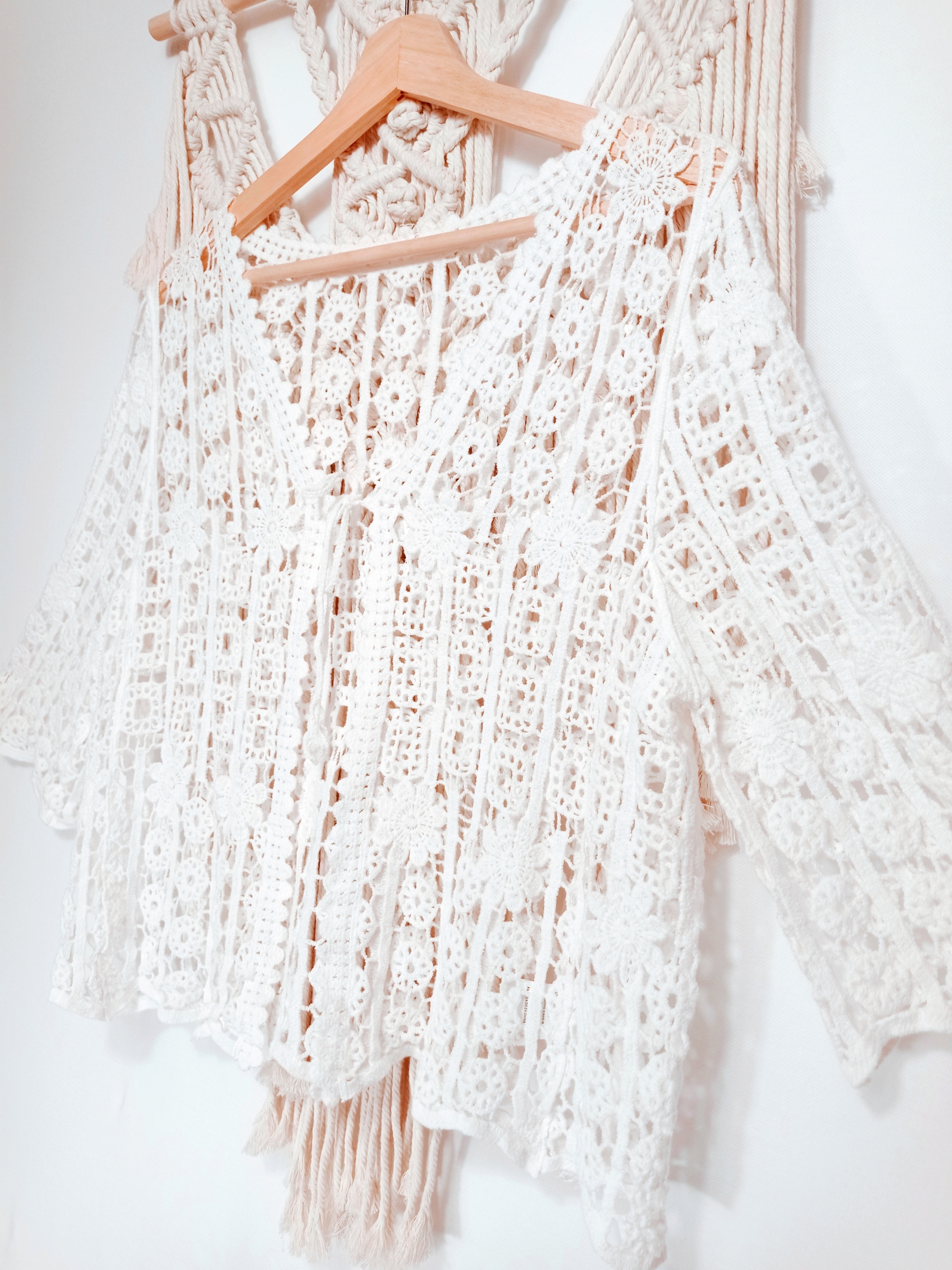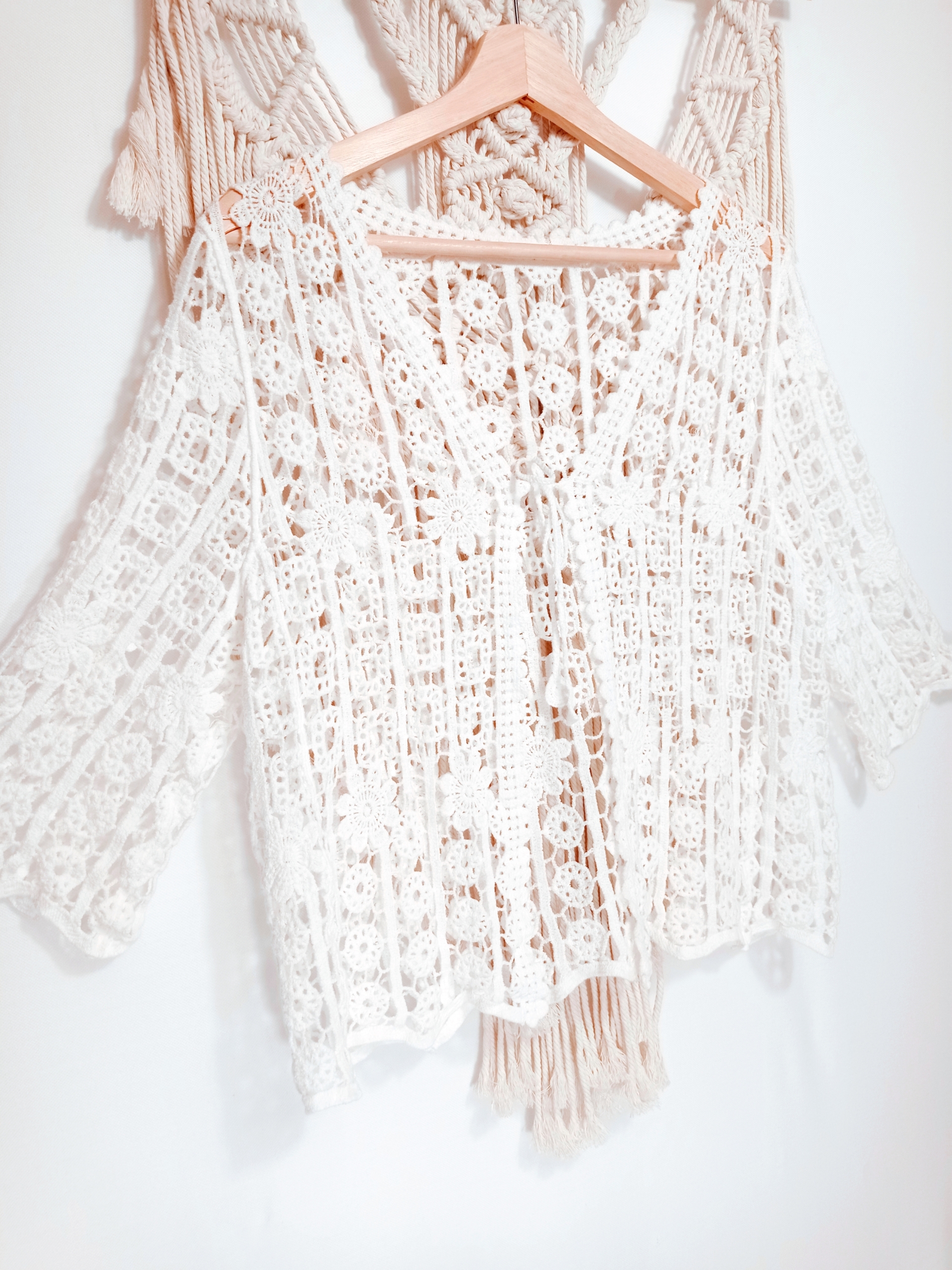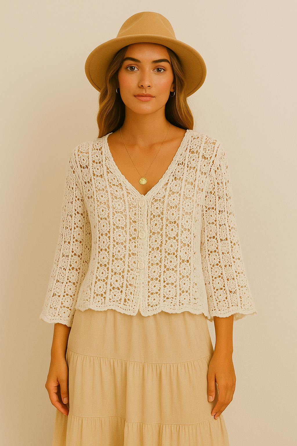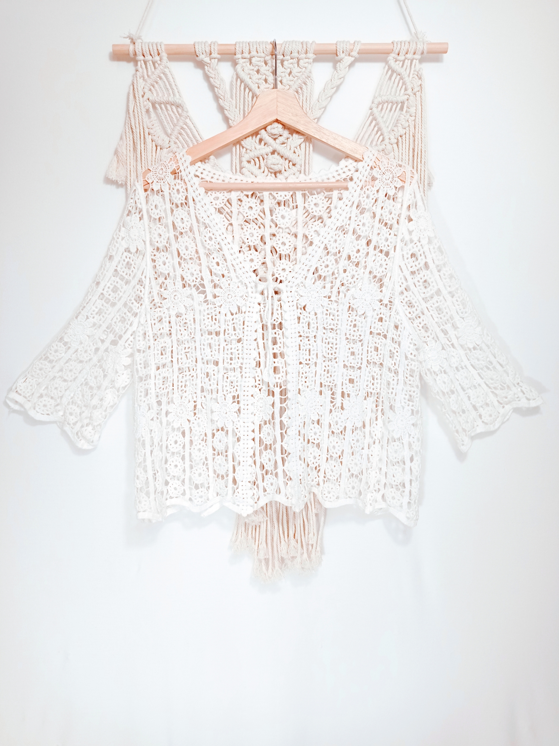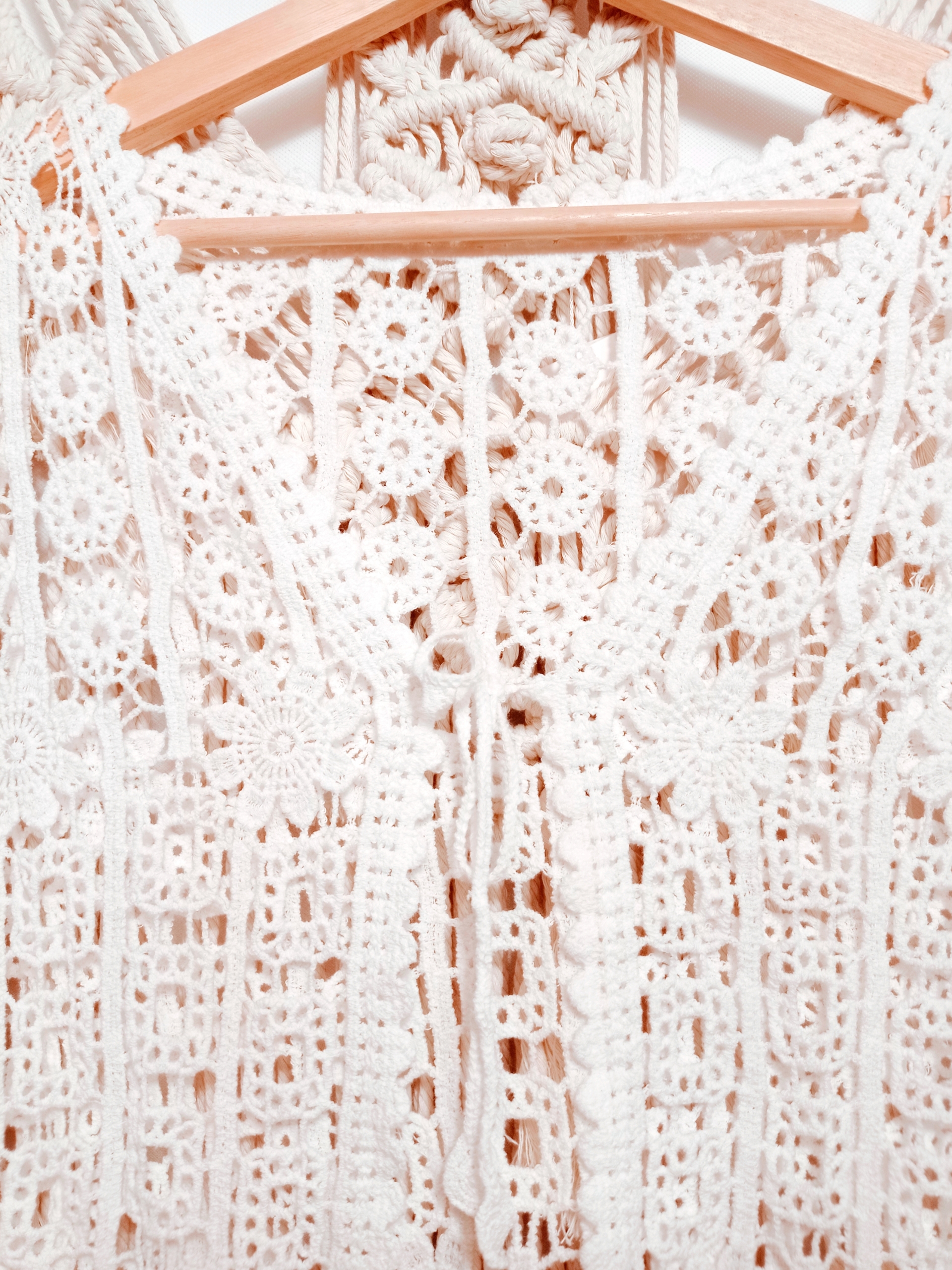 Esta chaqueta de ganchillo 100% algodón es una prenda versátil y elegante, ideal para añadir un toque de estilo boho chic ibicenco a cualquier atuendo. Con sus mangas de 3/4 y diseño aireado, esta chaqueta es perfecta para los dÃas cálidos y las noches frescas, proporcionando comodidad y sofisticación.