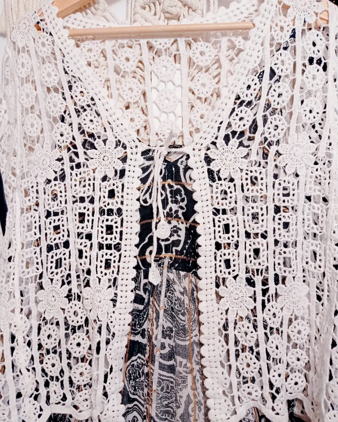 Esta chaqueta de ganchillo 100% algodón con mangas de 3/4 y estilo ibicenco es una prenda esencial para cualquier guardarropa. Disponible en blanco, su diseño de inspiración artesanal y versátil la convierte en una elección perfecta para cualquier ocasión.