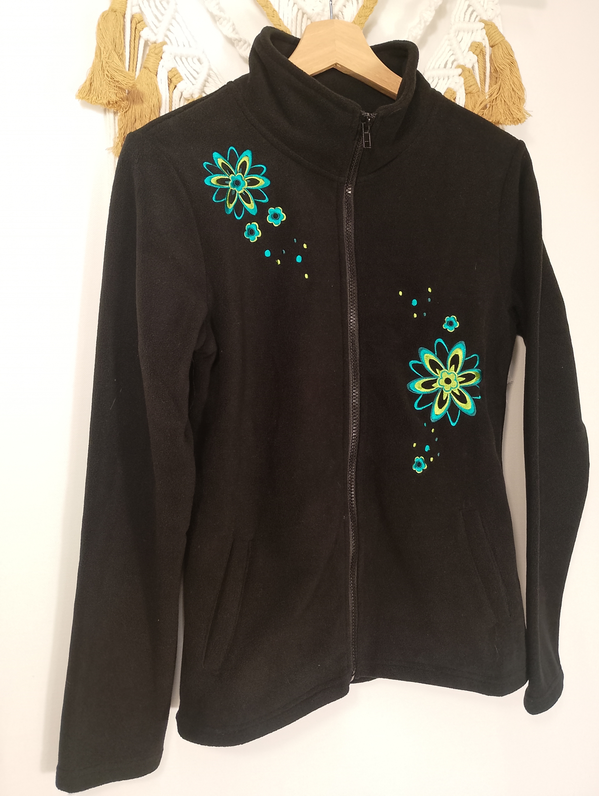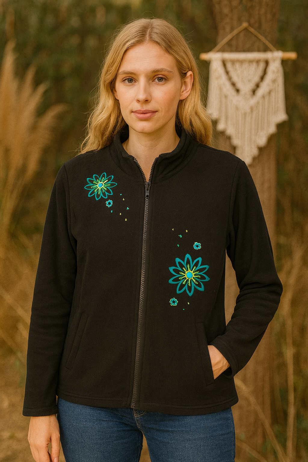 AbrÃgate con estilo con esta chaqueta de forro polar de alta calidad marca Coline. Suave, cálida y ligera. Su diseño con bordado floral aporta un toque original y femenino. Con cremallera frontal, cuello alto y bolsillos laterales para mayor comodidad.