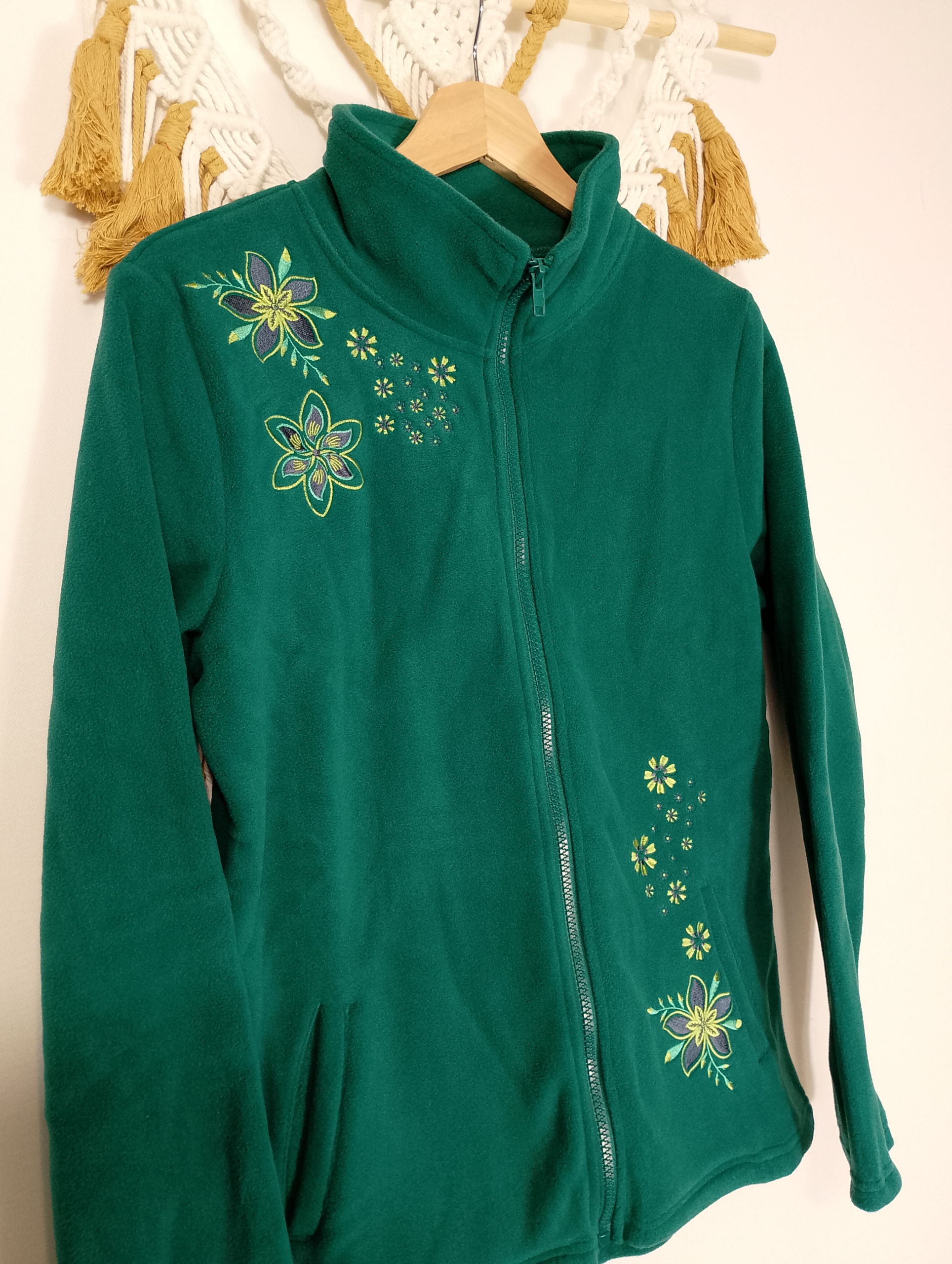 AbrÃgate con estilo con esta chaqueta de forro polar de alta calidad marca Coline. Suave, cálida y ligera. Su diseño con bordado floral aporta un toque original y femenino. Con cremallera frontal, cuello alto y bolsillos laterales para mayor comodidad.