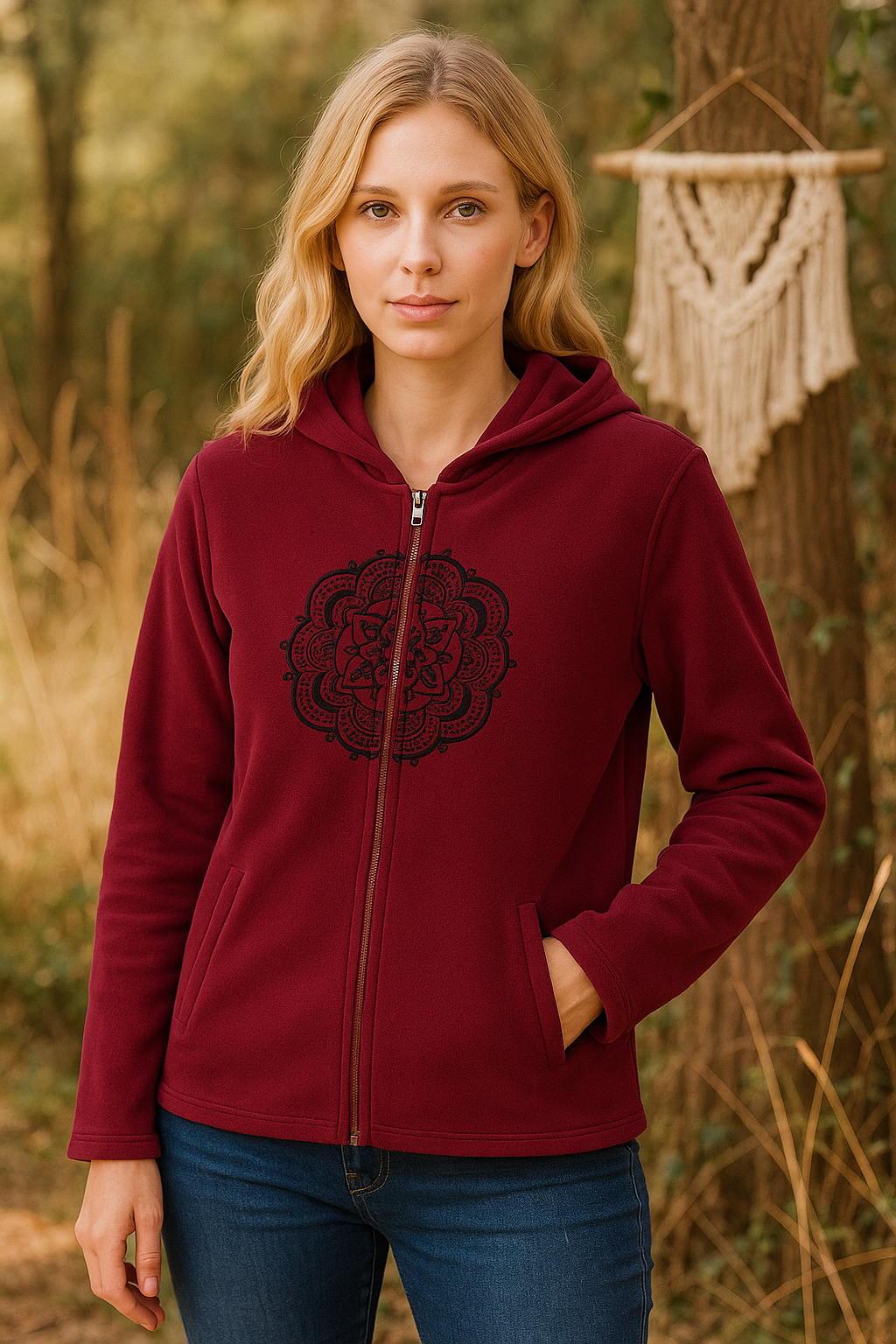 Chaqueta de forro polar Coline con capucha y un precioso bordado de mándala en el pecho. Suave, cálida y con un estilo boho único. Ideal para el frÃo y disponible en burdeos, caqui y negro.