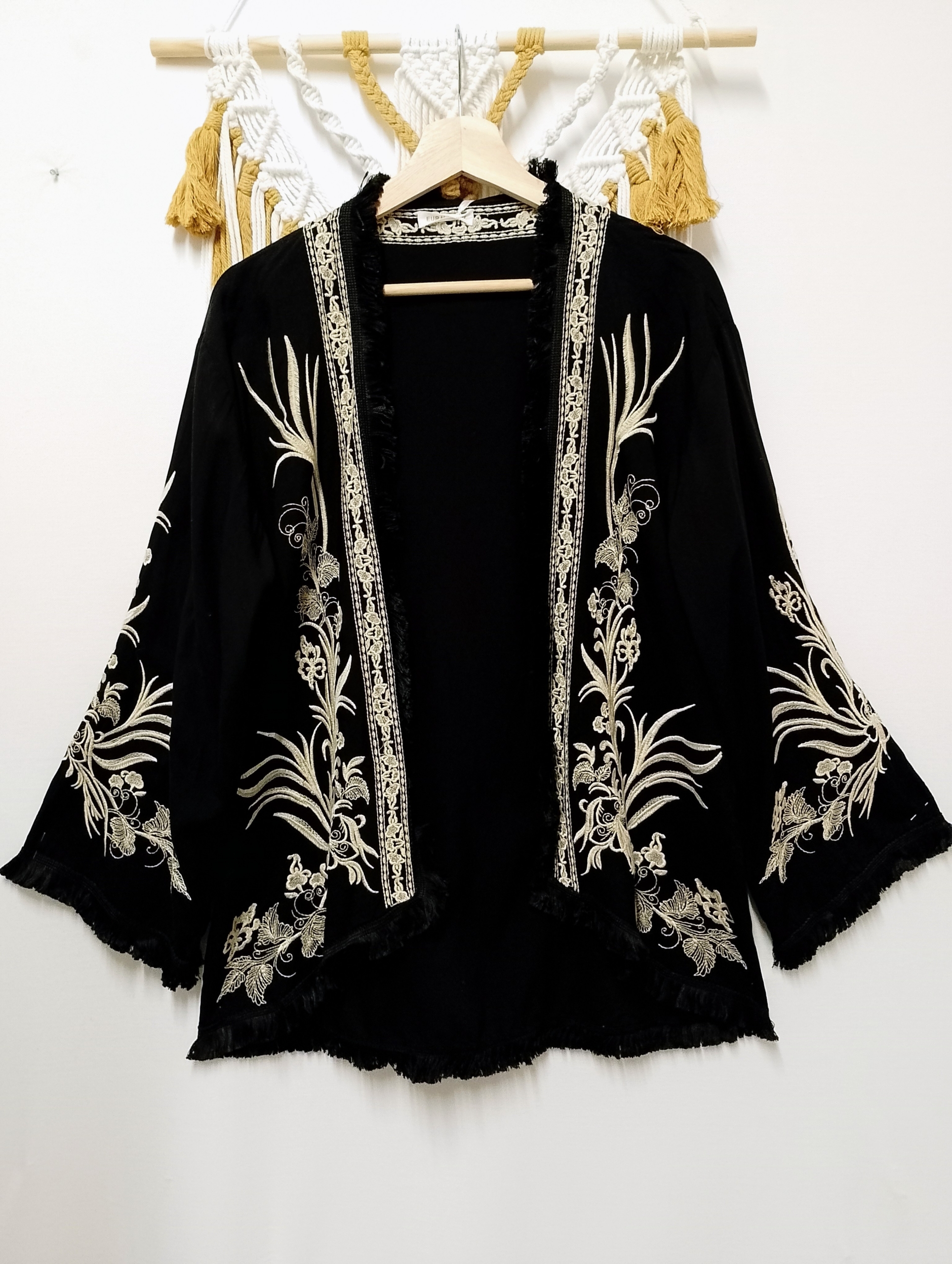 La chaqueta kimono Sultana bordada de algodón es una prenda única que combina la elegancia artesanal con el espíritu libre del estilo boho. Diseñada para mujeres que buscan un equilibrio entre comodidad, originalidad y estilo, esta pieza se convierte en la protagonista de cualquier look.