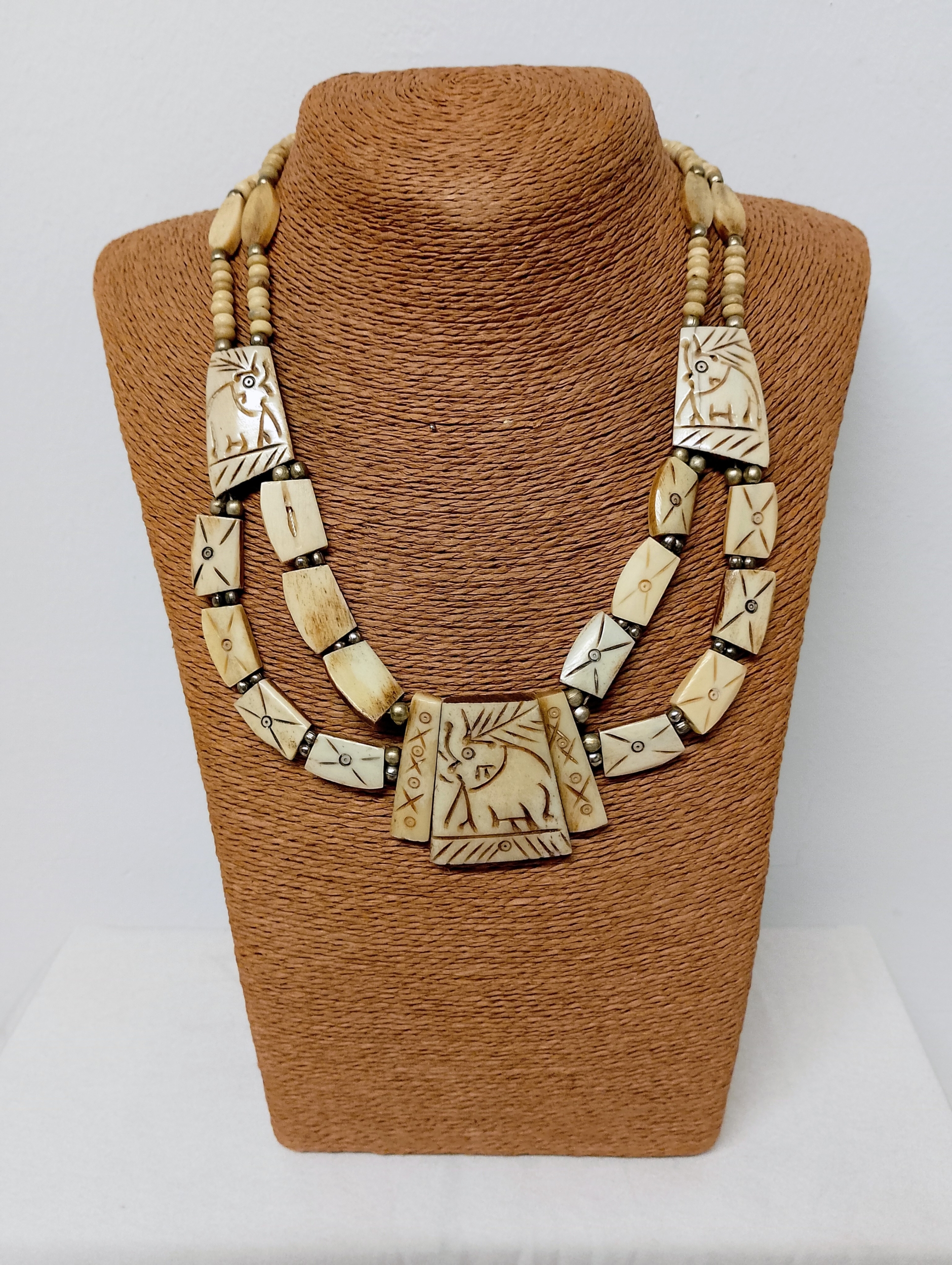 Su diseño de doble hilera con cuentas y bloques tallados crea un equilibrio perfecto entre textura y movimiento. Los tonos marfil y beige aportan calidez y versatilidad, haciendo que el collar África de hueso combine fácilmente con prendas naturales, tejidos rústicos o looks más modernos.
