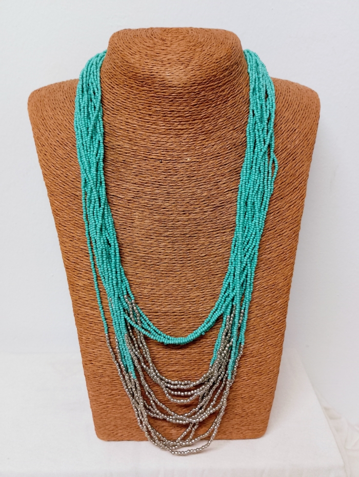 - Materiales: Cuentas turquesas y plateadas con cordón de cuero