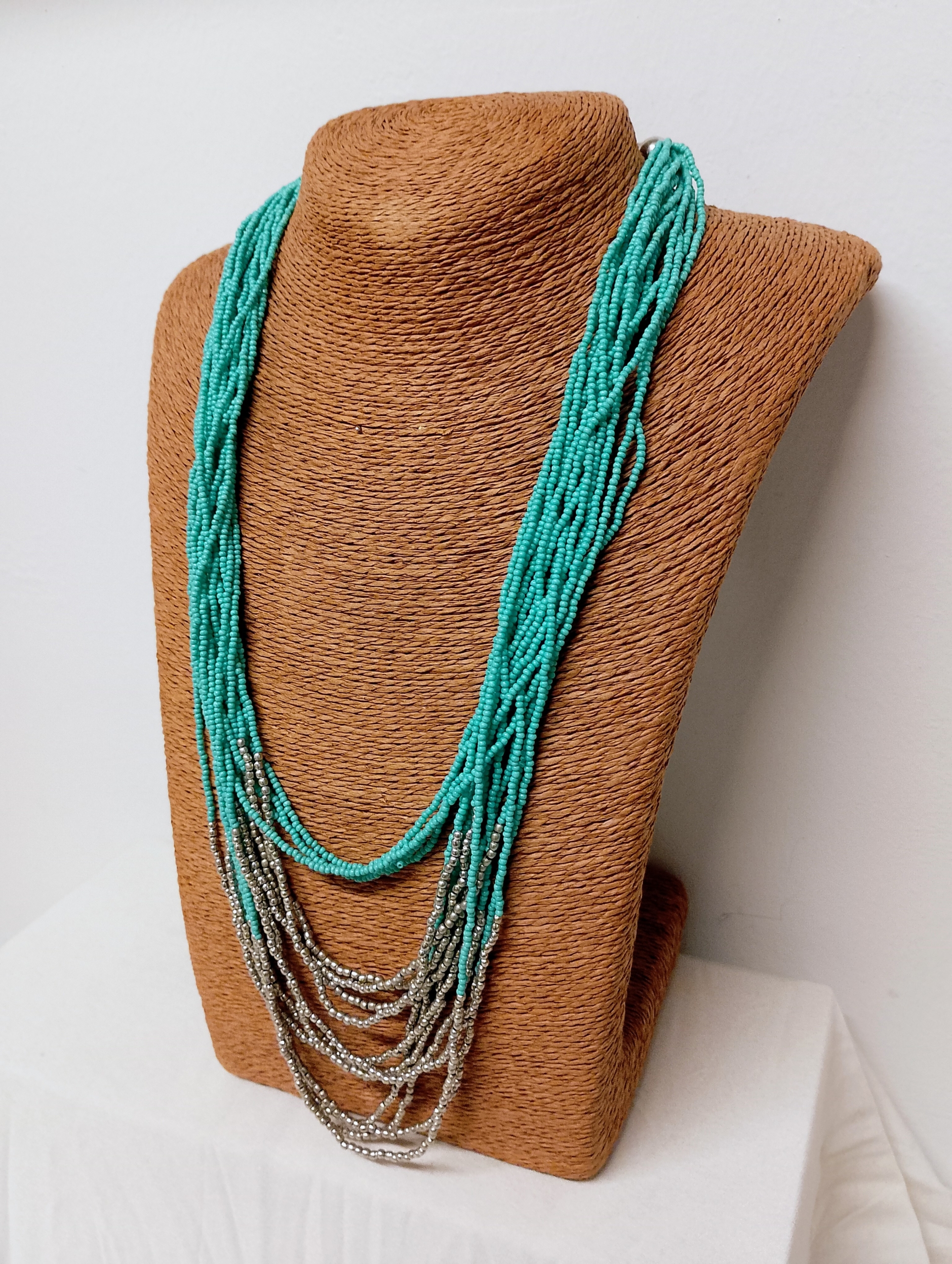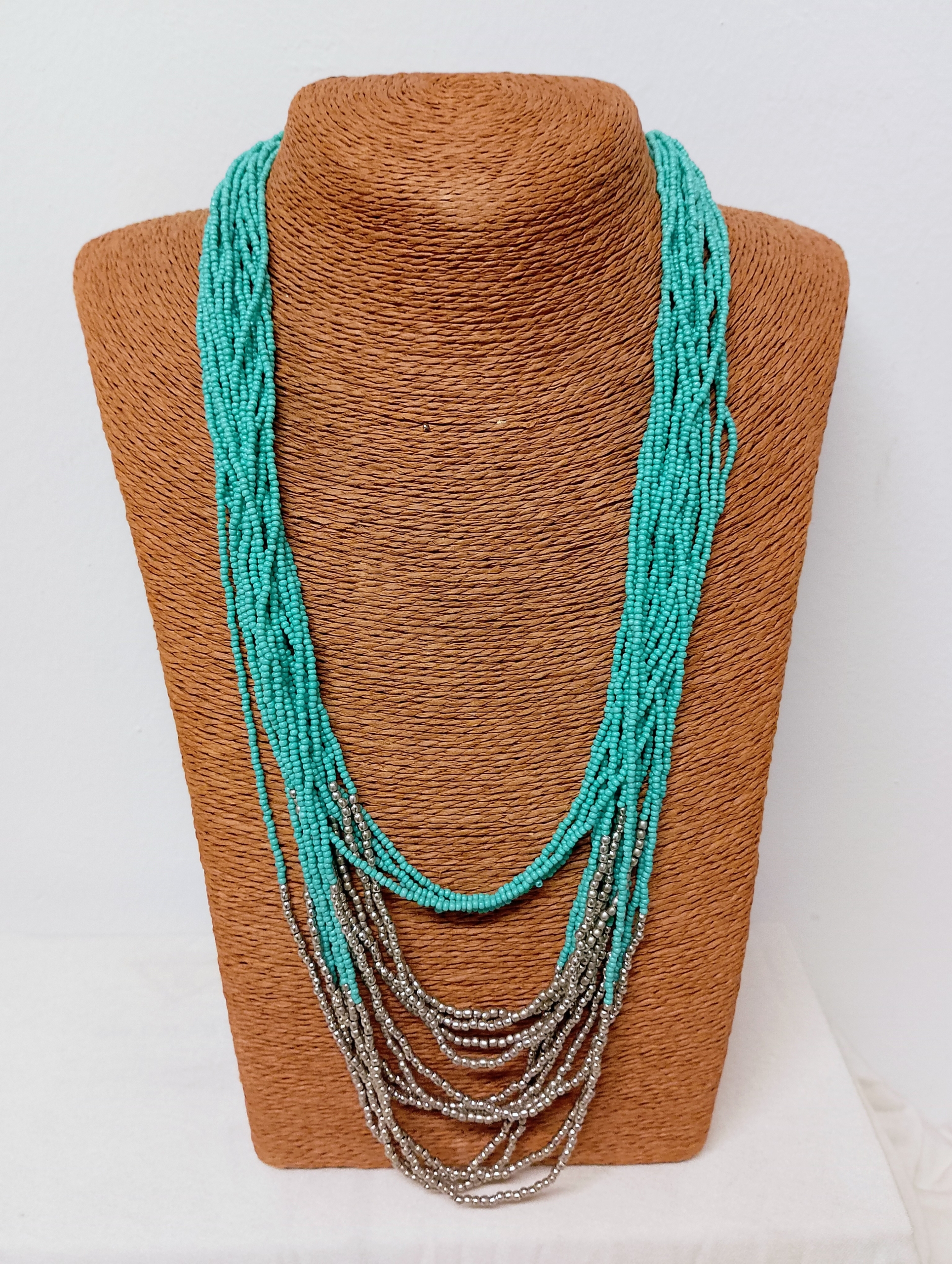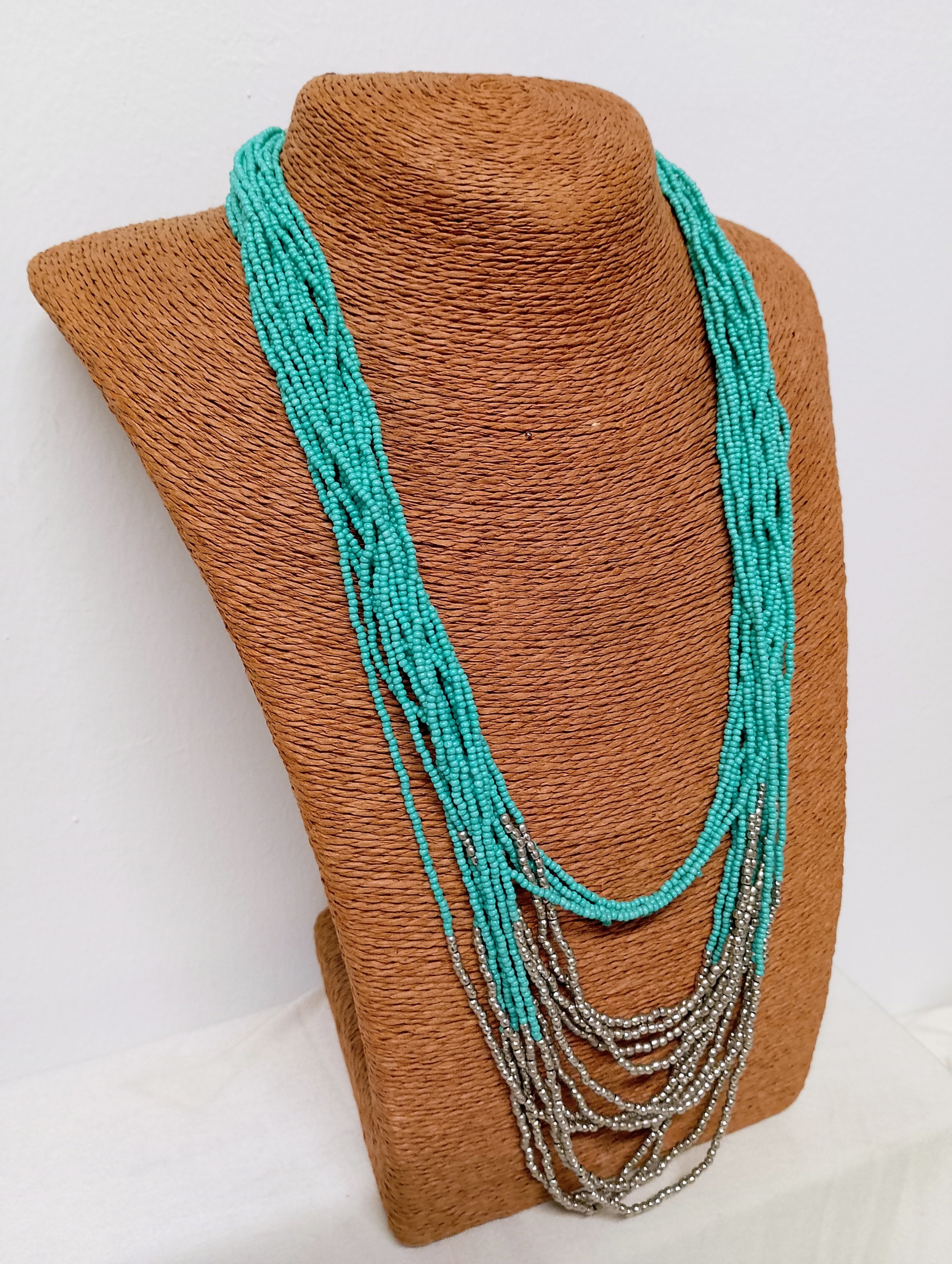 El Collar Cleopatra combina la fuerza de un diseño artesanal con la frescura del estilo bohemio. Con hileras de cuentas turquesas y plateadas y un cordón de cuero ajustable, esta joya es perfecta para aportar color, movimiento y personalidad a cualquier look.