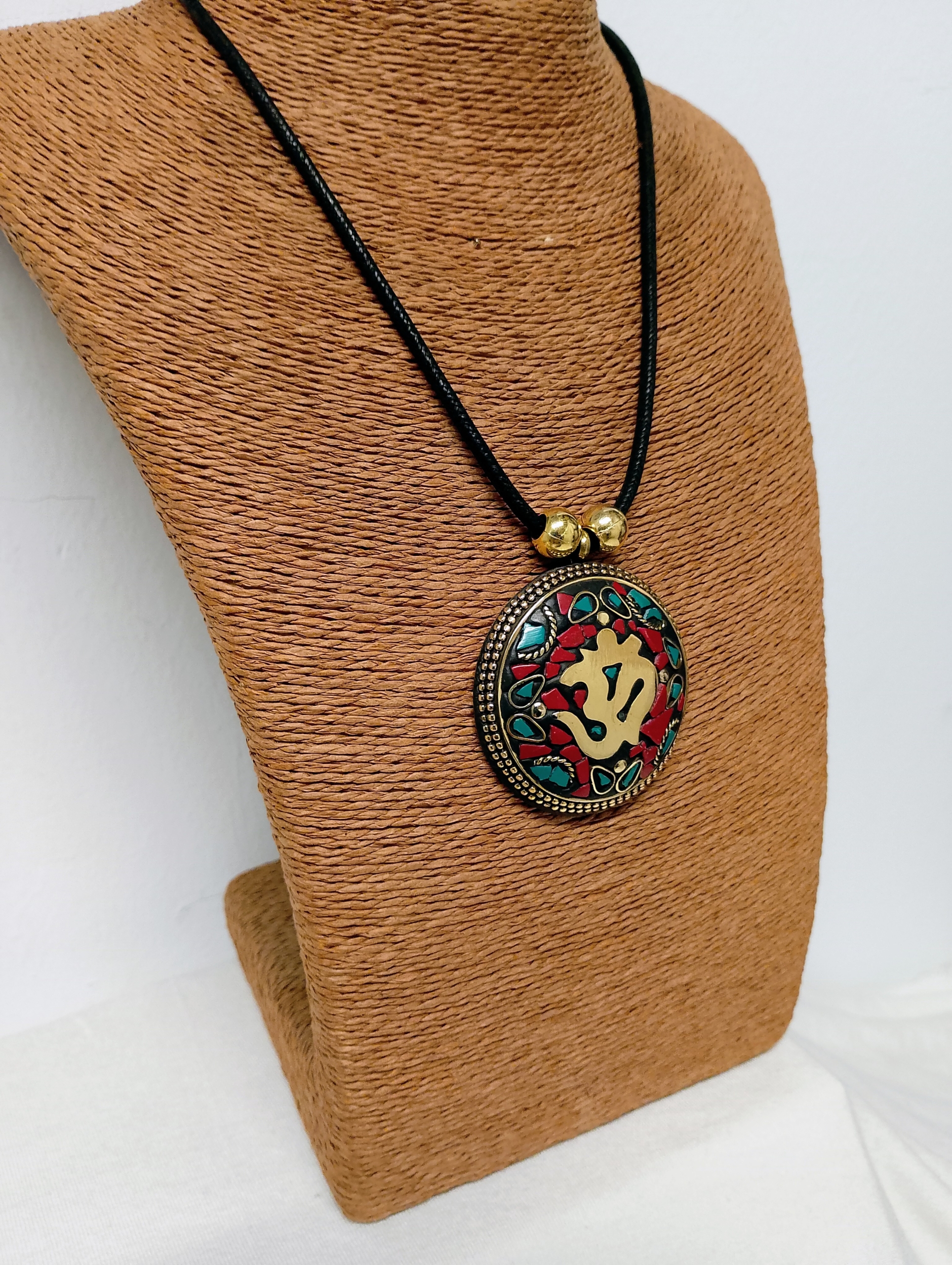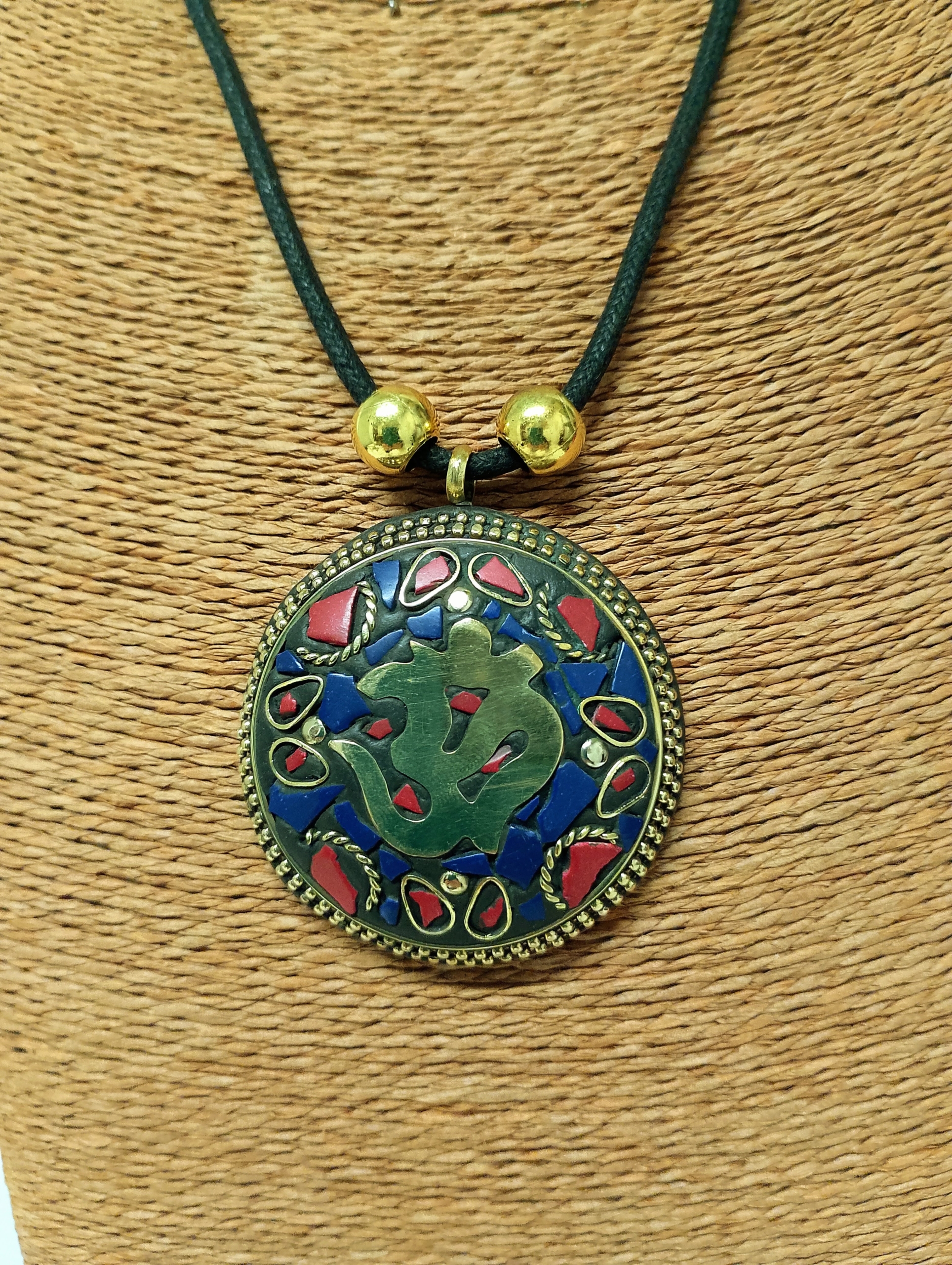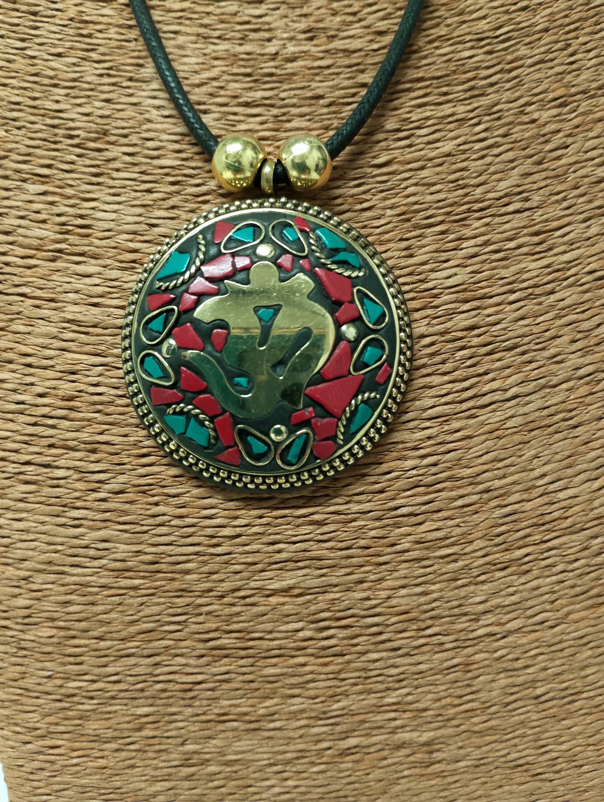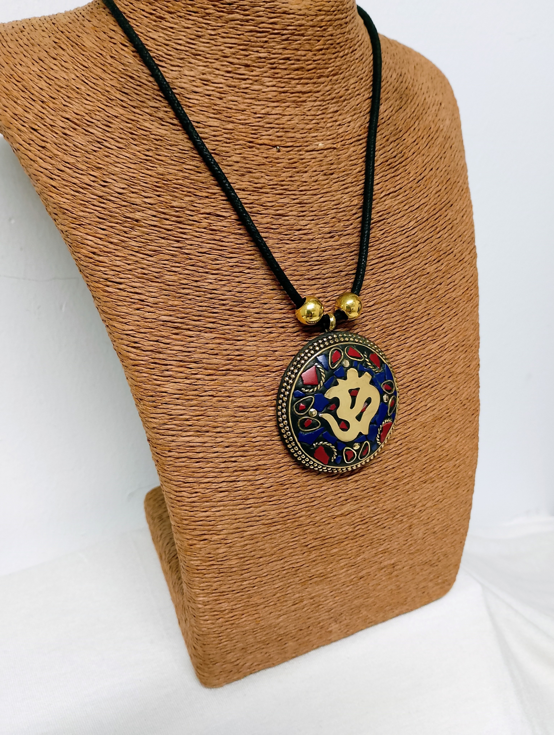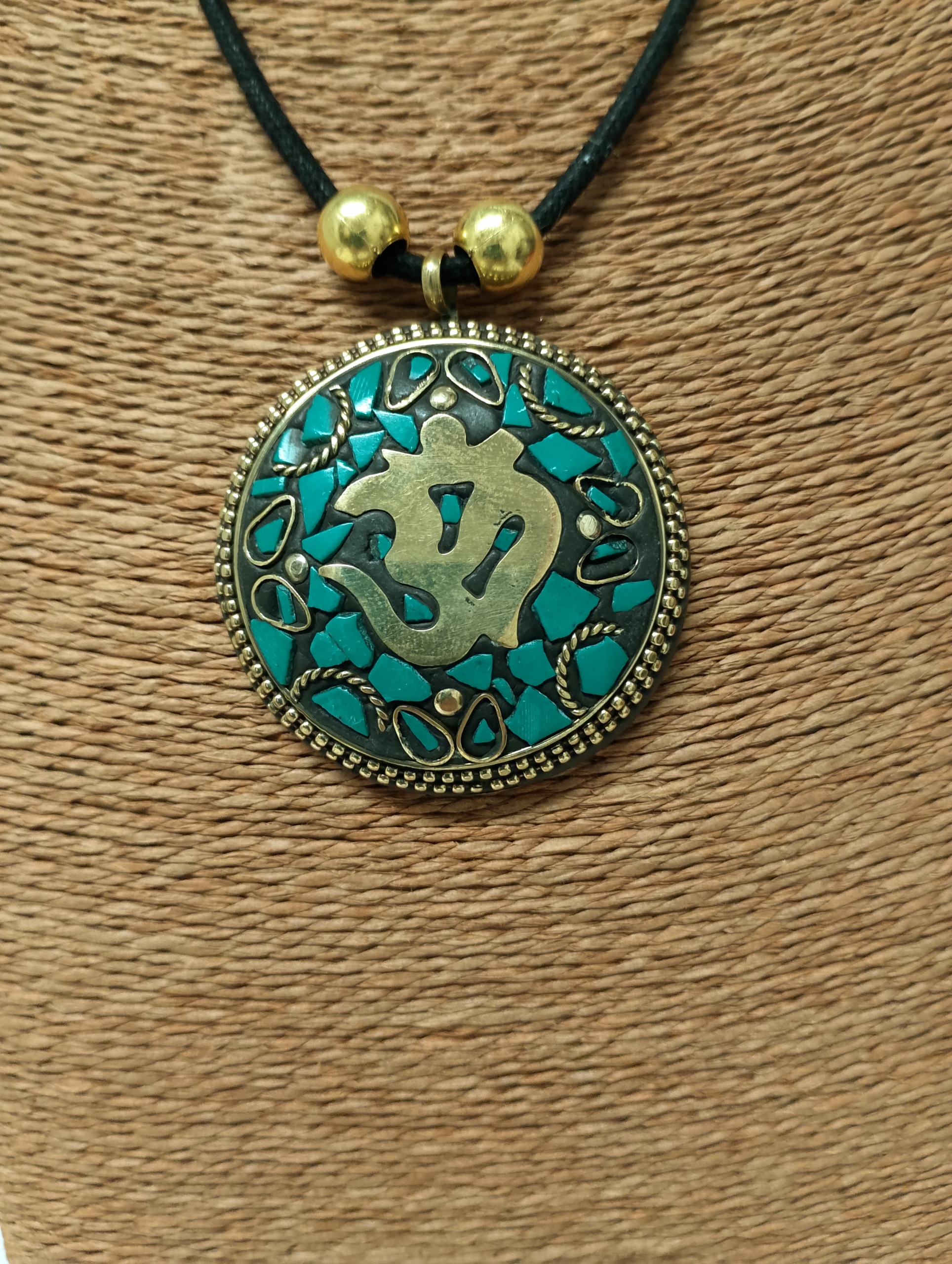 Su colgante redondo muestra el símbolo sagrado OM (ॐ), representación universal de la energía vital y la conexión entre cuerpo, mente y espíritu.