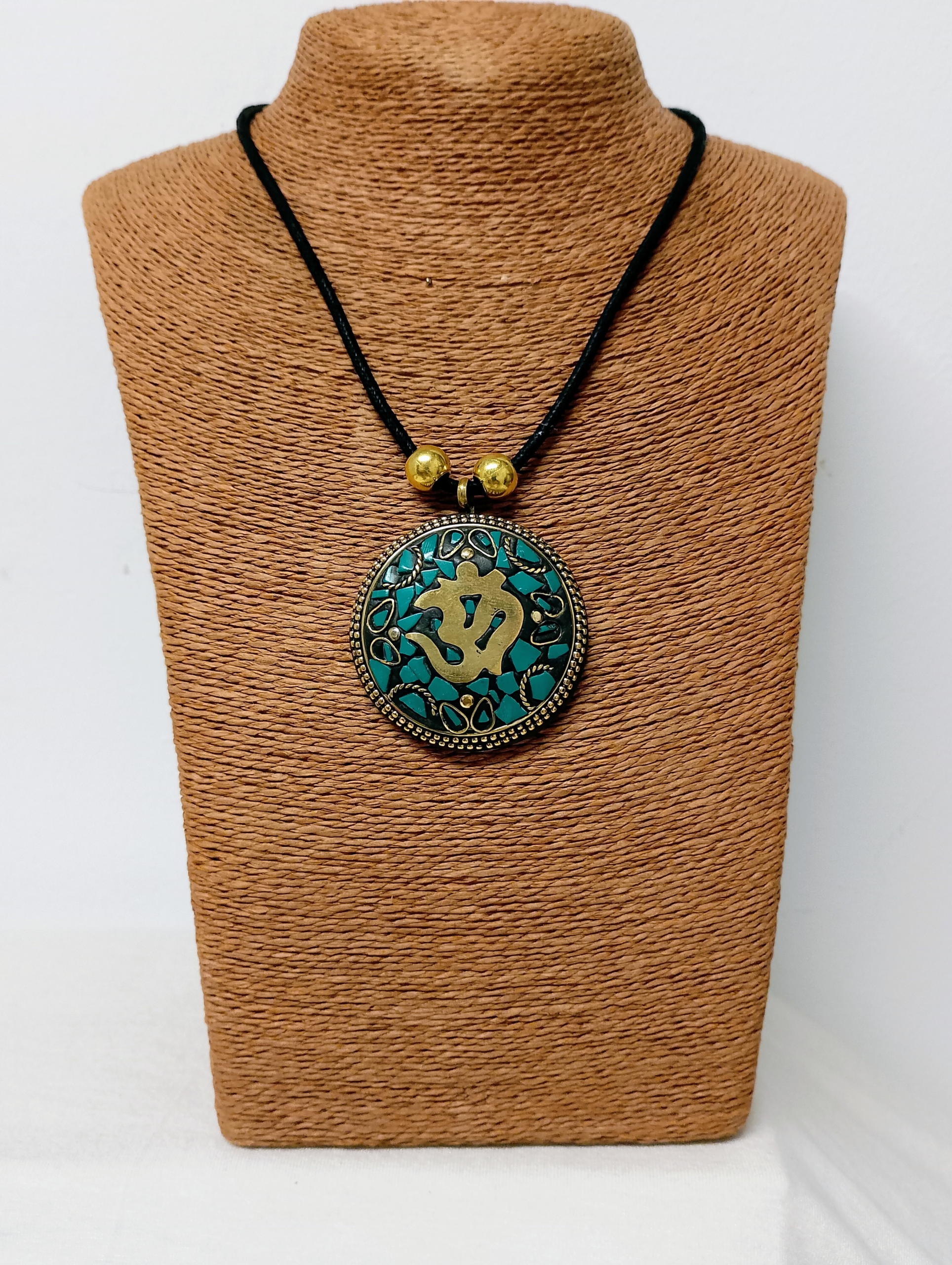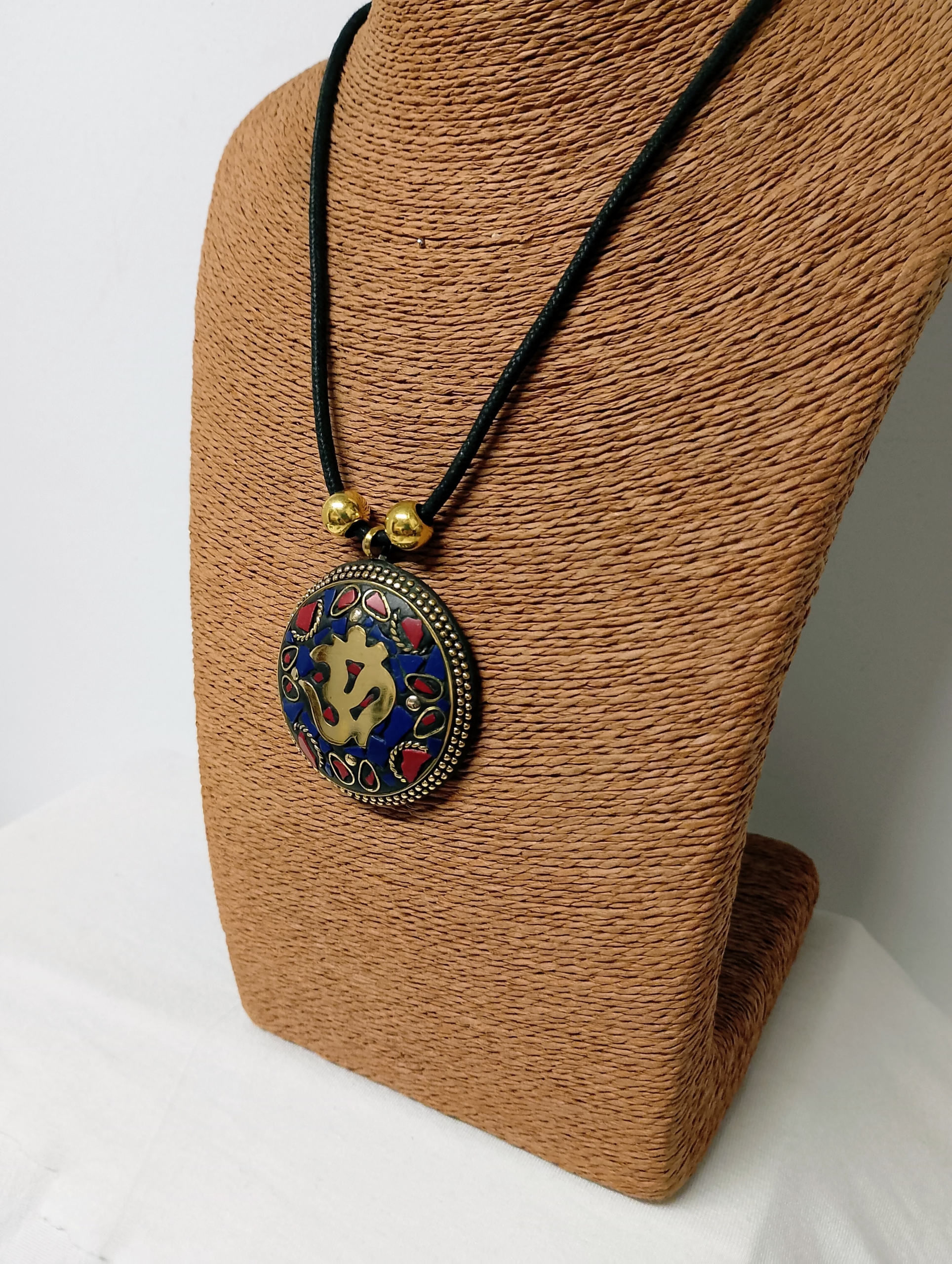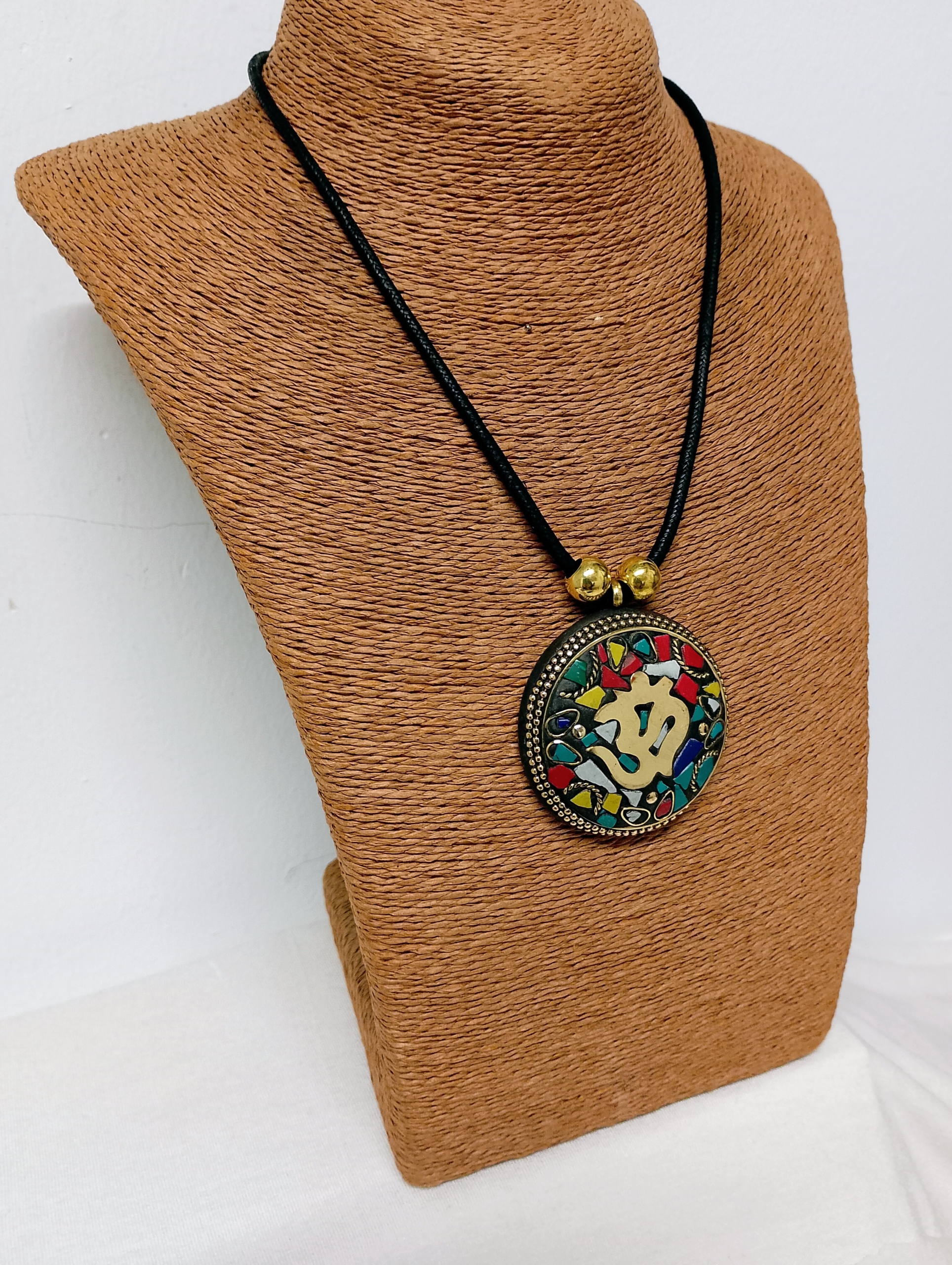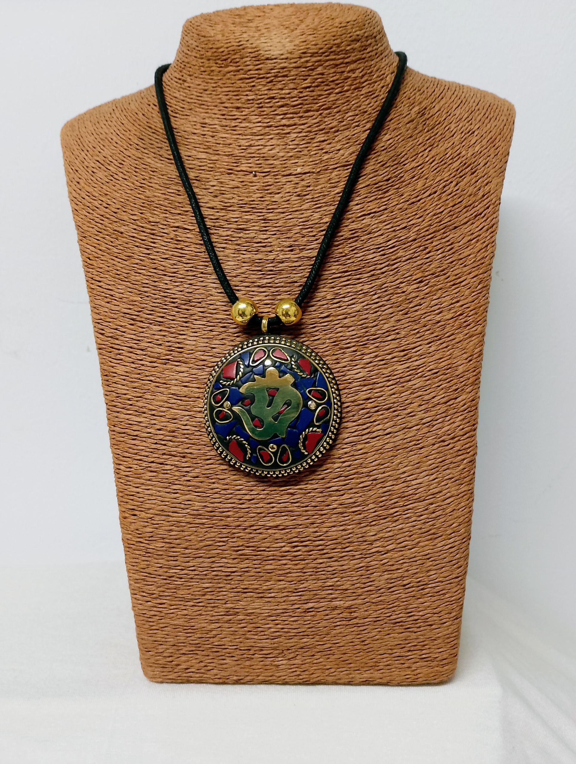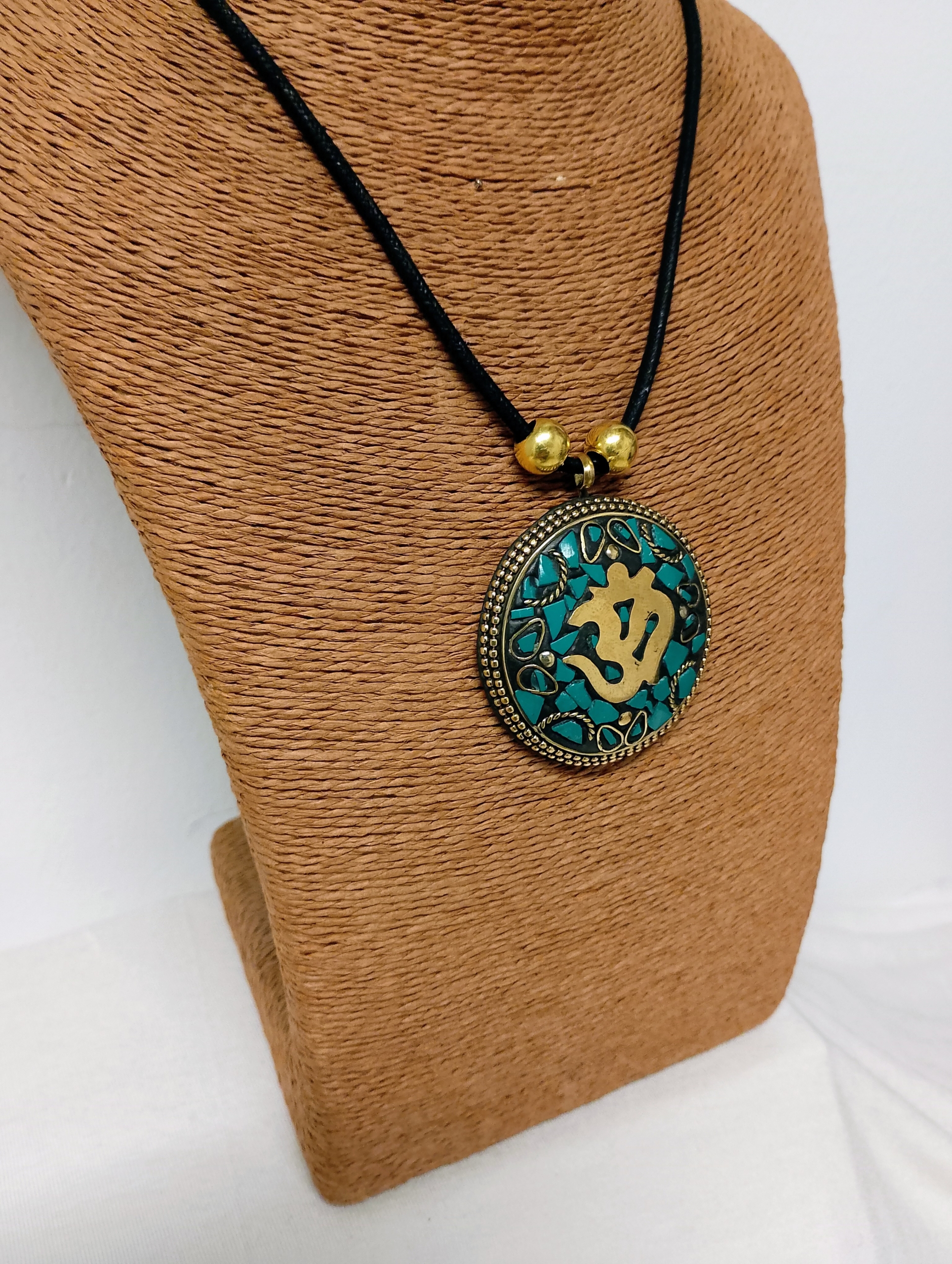 Su colgante redondo muestra el símbolo sagrado OM (ॐ), representación universal de la energía vital y la conexión entre cuerpo, mente y espíritu.