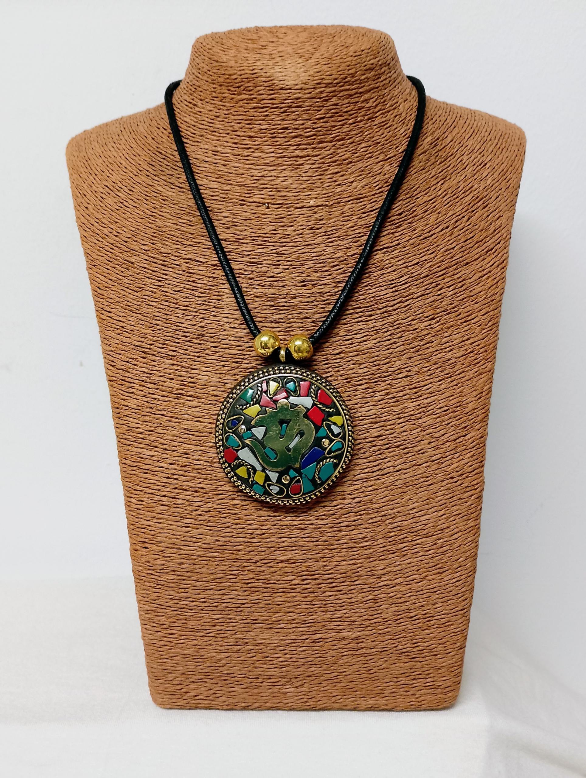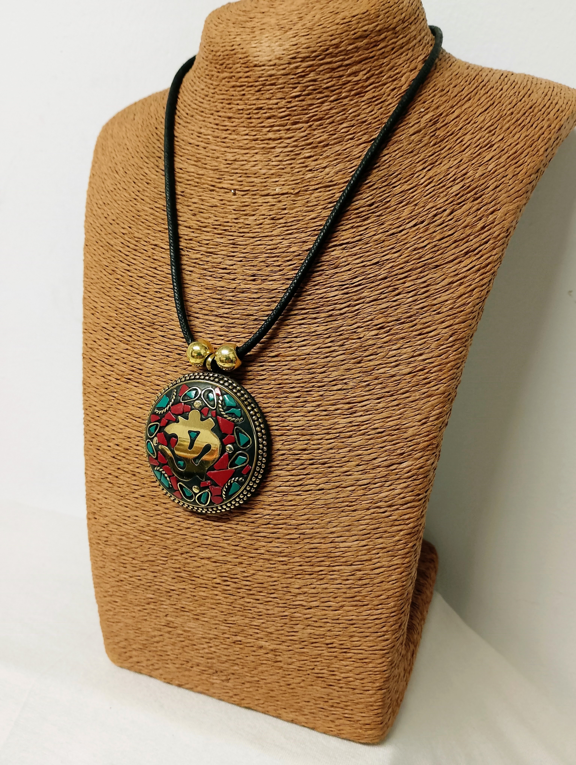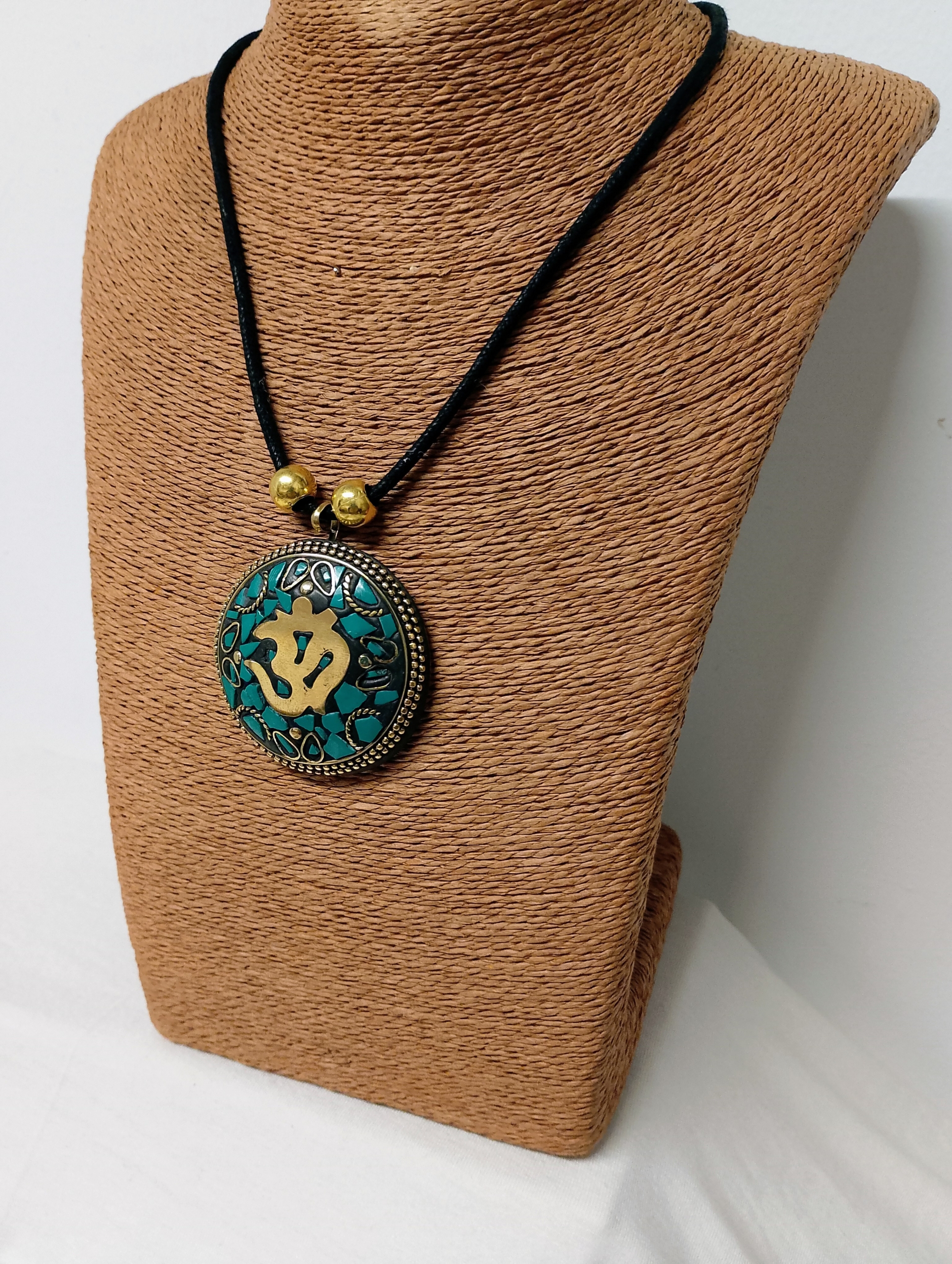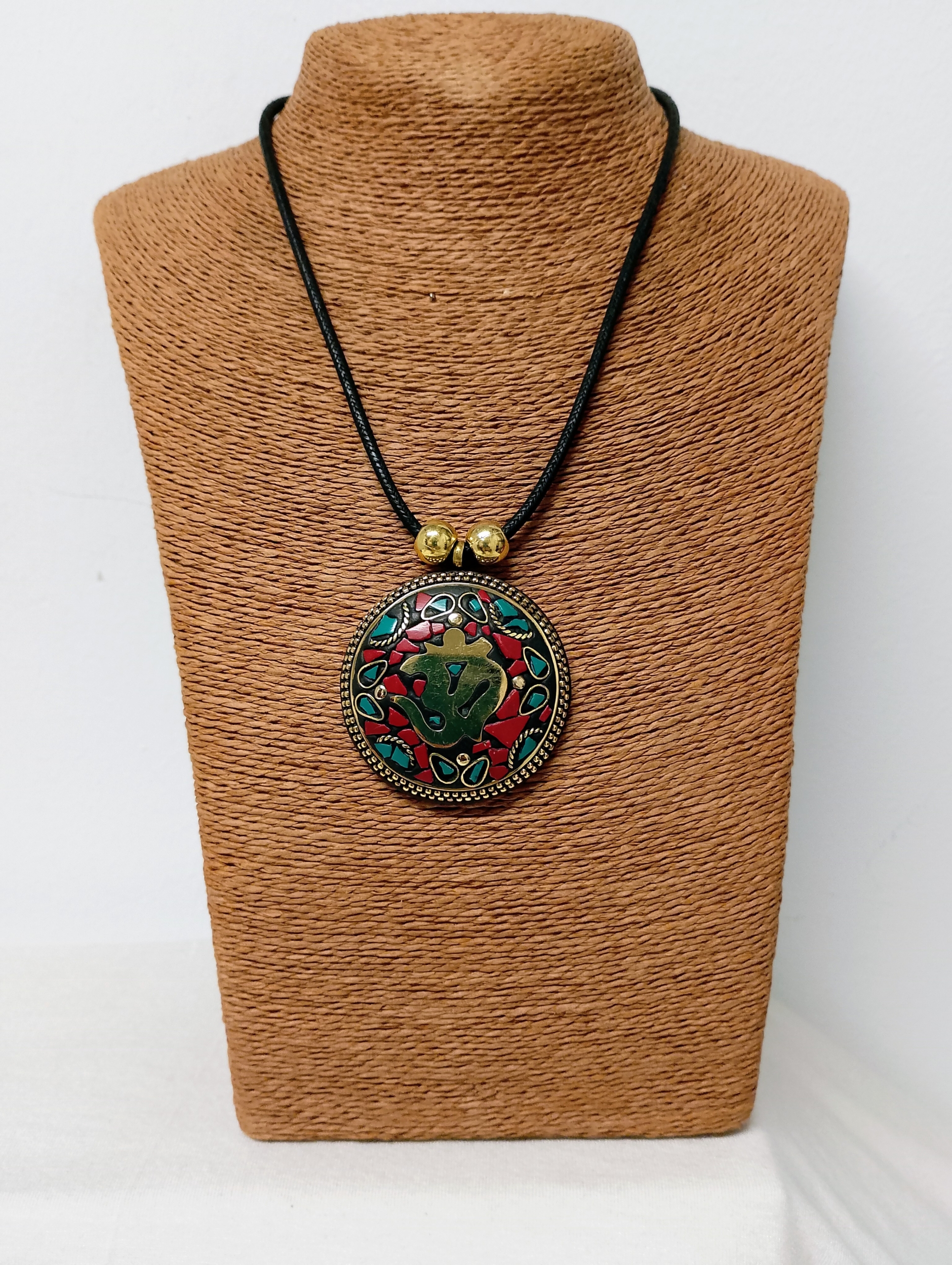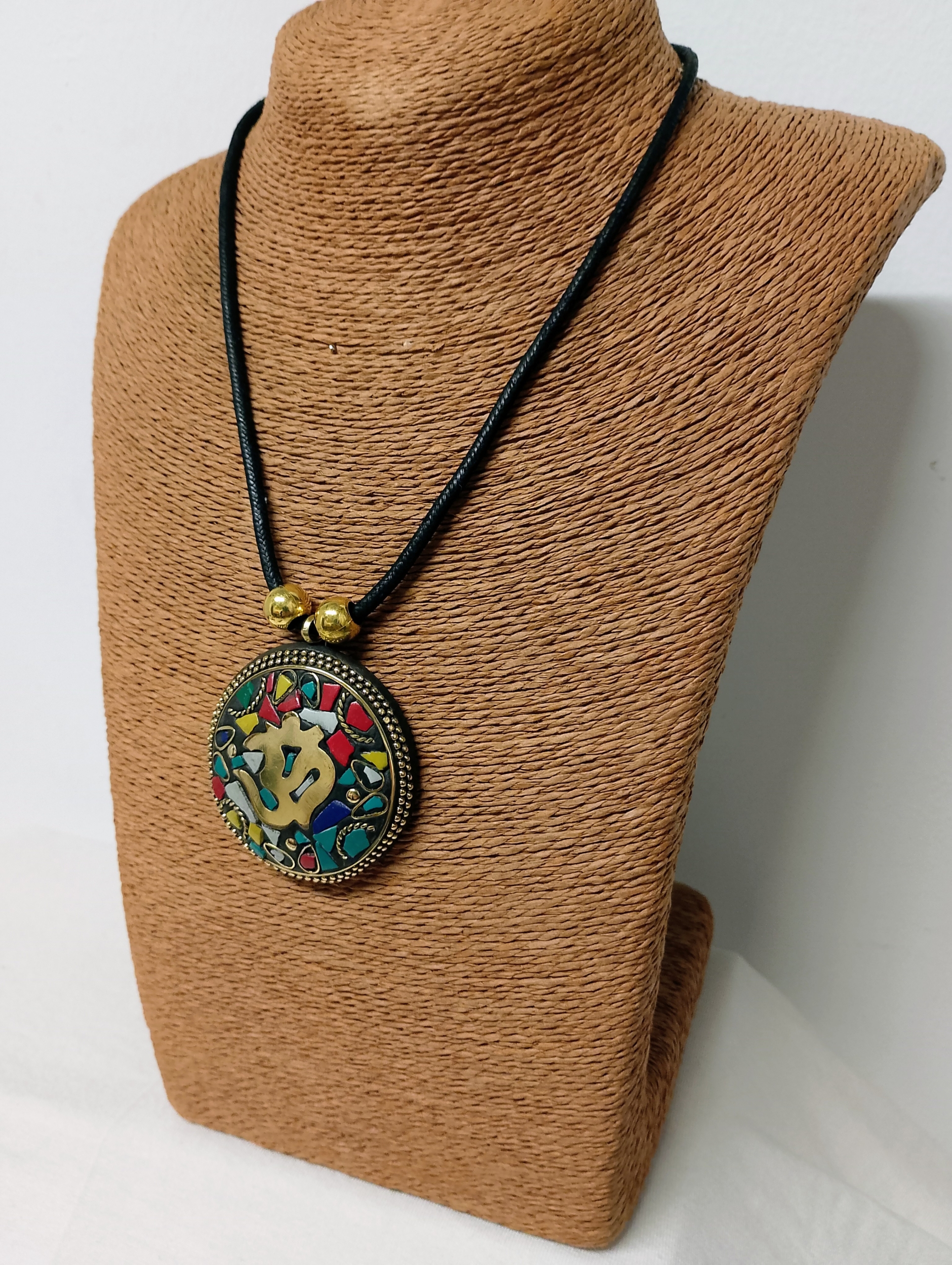 Su colgante redondo muestra el símbolo sagrado OM (ॐ), representación universal de la energía vital y la conexión entre cuerpo, mente y espíritu.