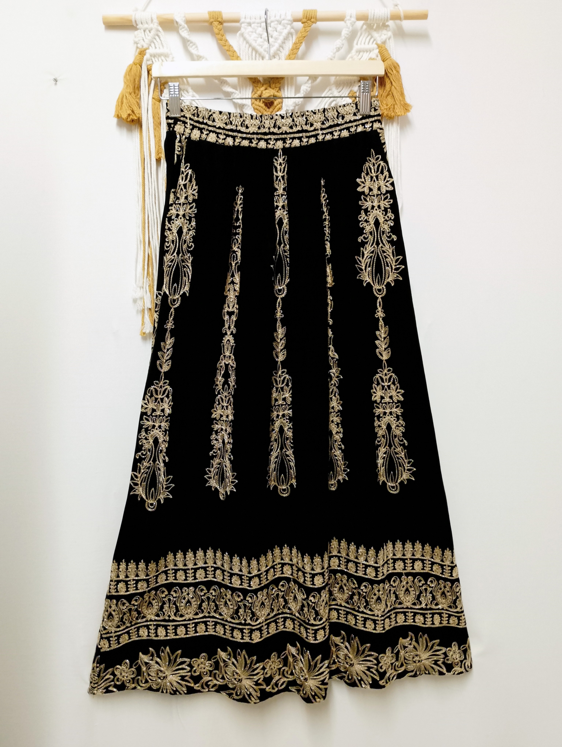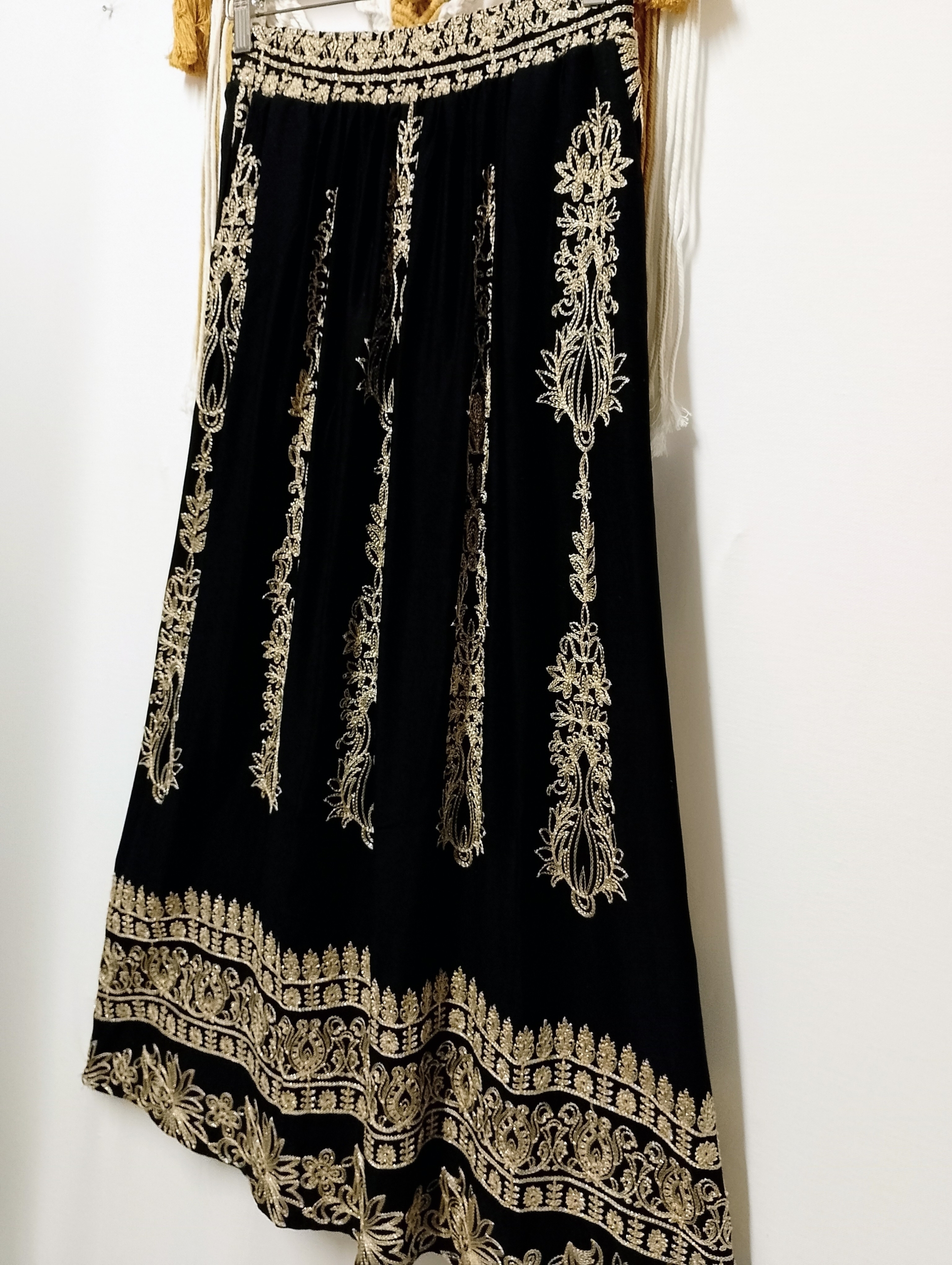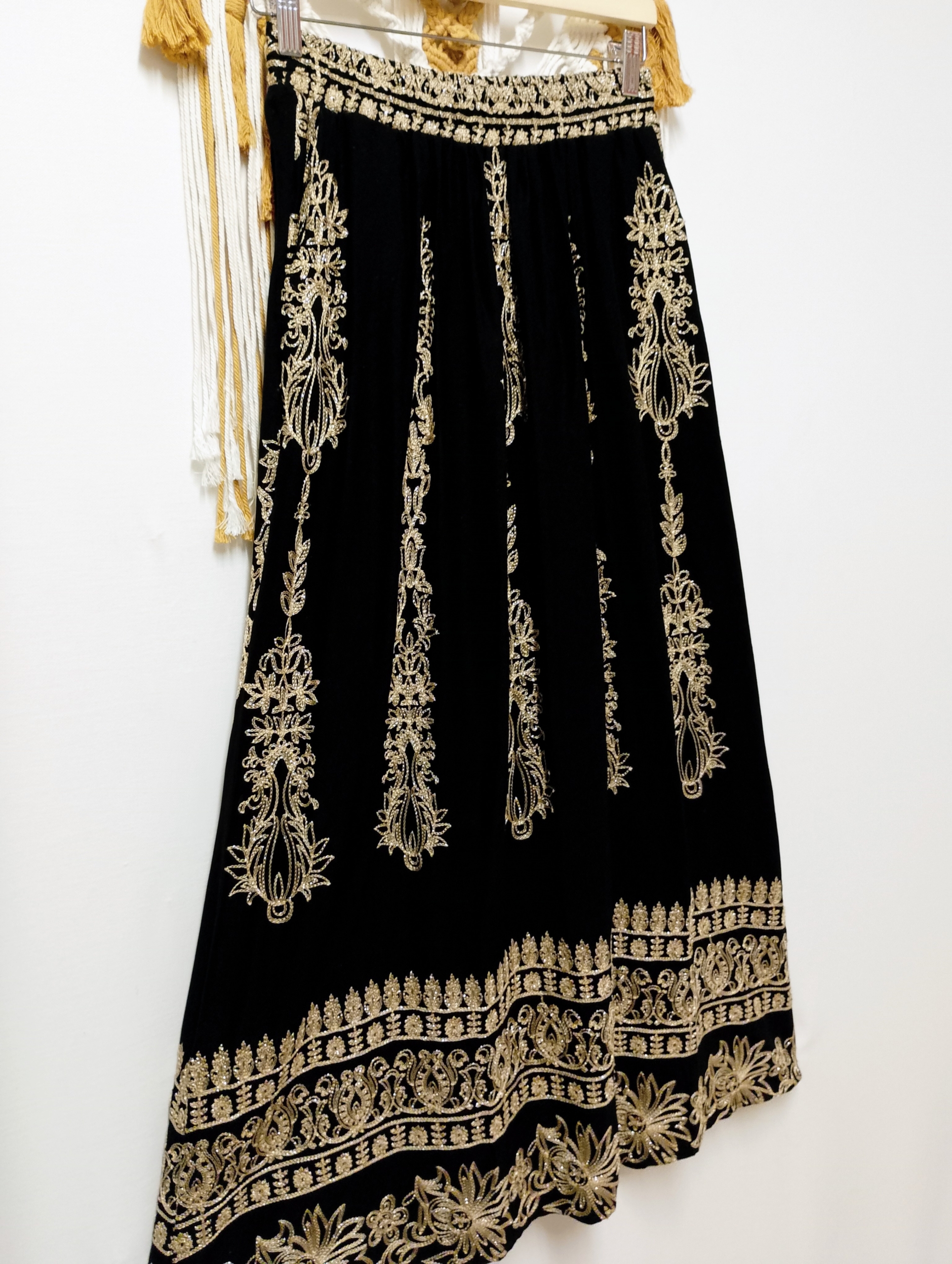 La falda bordada Samira es una pieza llena de estilo y personalidad. Su diseño, inspirado en bordados orientales, combina el negro profundo con detalles dorados que aportan un brillo sutil y elegante.