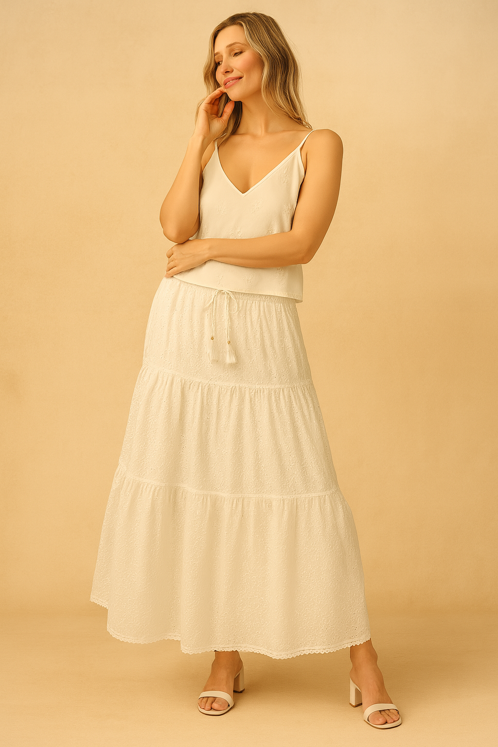 Falda boho de algodón largo estilo Ibicenco con bordados y vuelo fluido. Suave, natural y elegante, perfecta para los días cálidos de primavera o verano.
