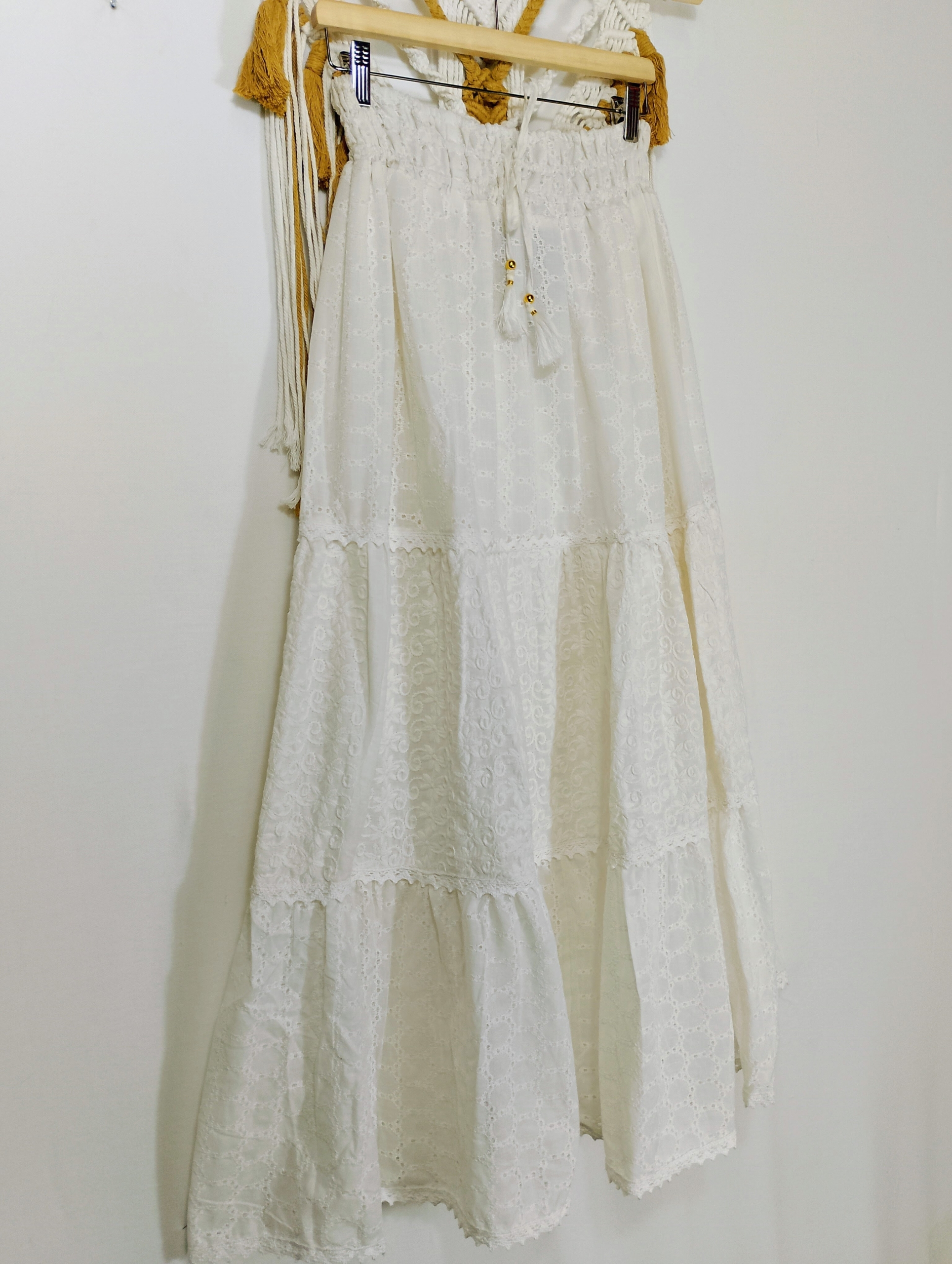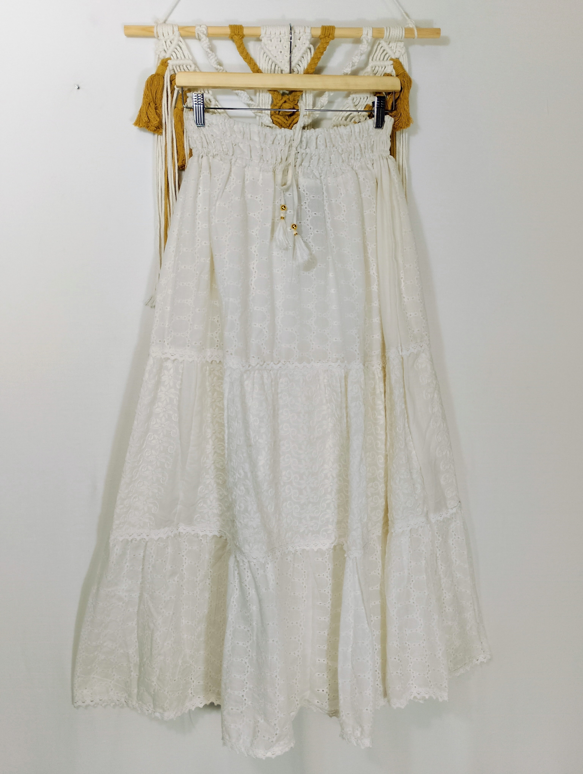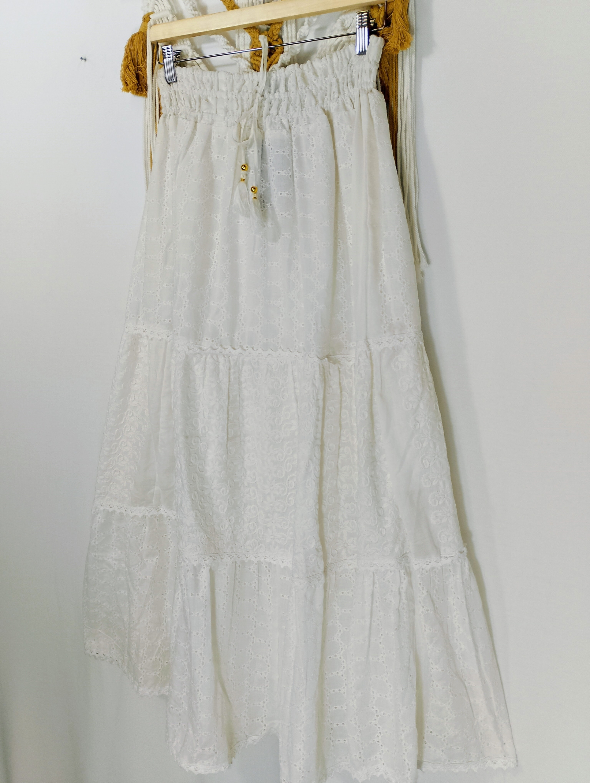 Artemisa es una falda 100% algodón larga con vuelo, bordados y forro interior, una opción encantadora para aquellos que buscan combinar estilo, comodidad y artesanía en una sola prenda.