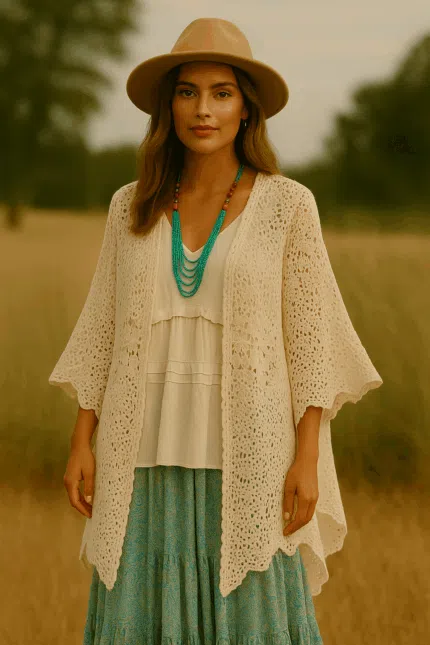 La Falda Ibiza Crochet está confeccionada en algodón 100% y presenta un diseño boho ibicenco con patrón artesanal inspirado, textura ligera y acabado natural. Es una prenda versátil para looks frescos y femeninos.