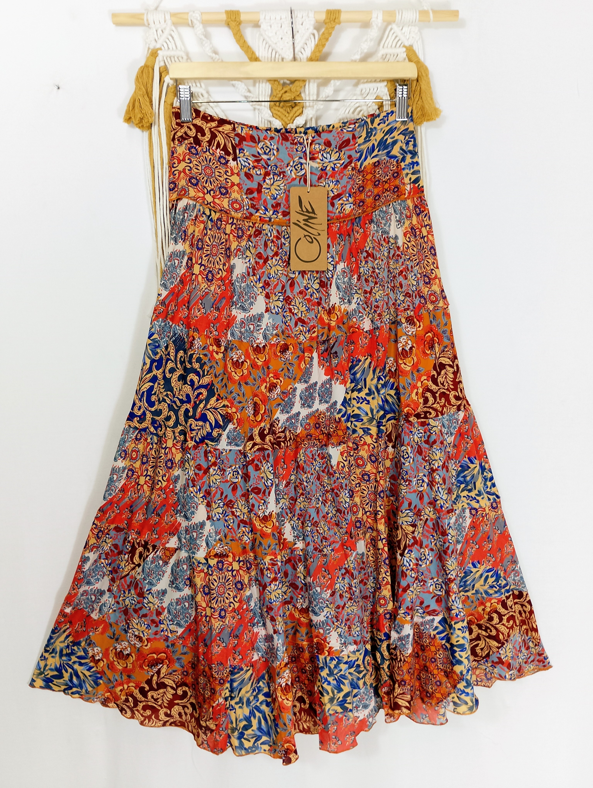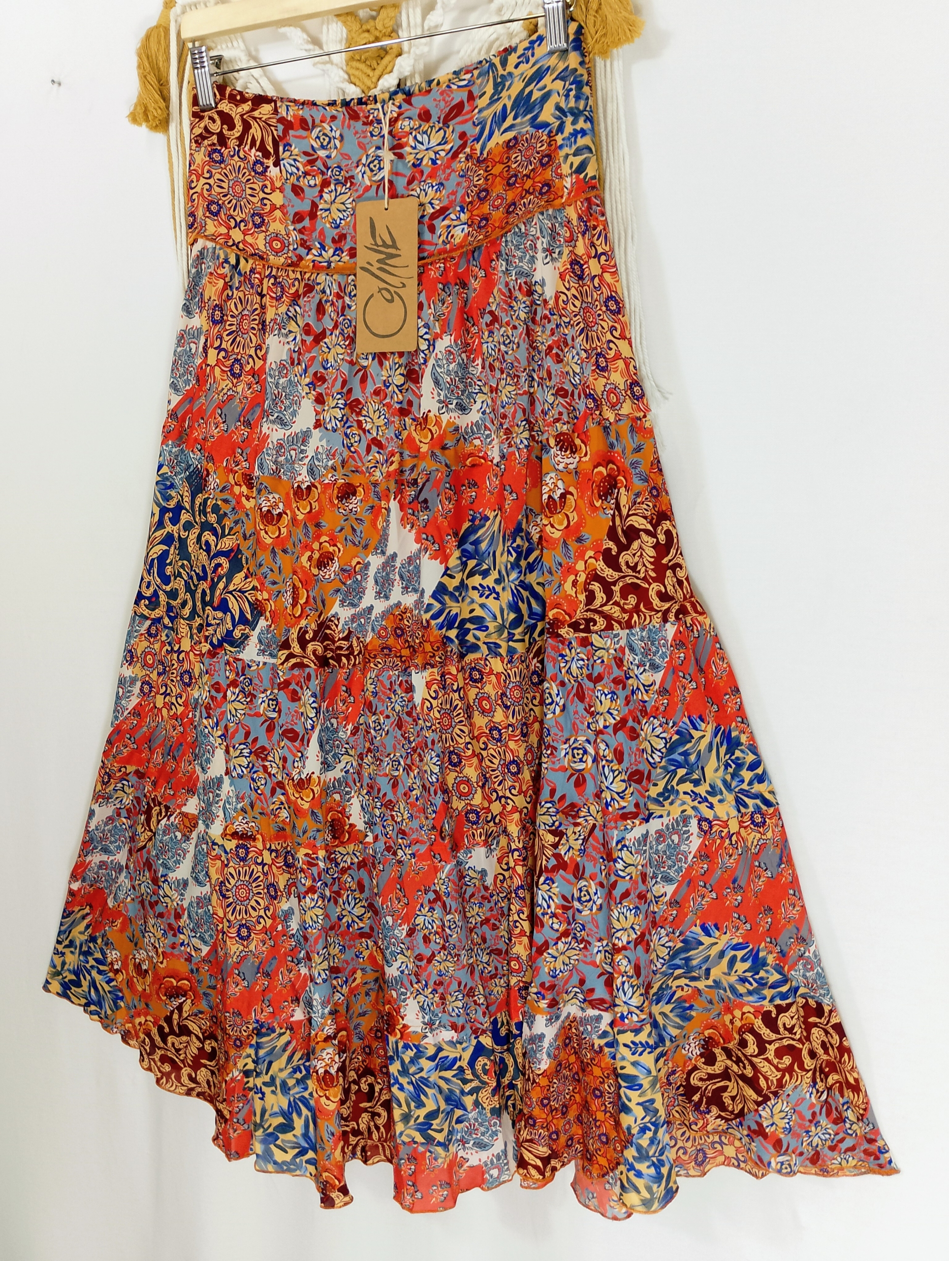 La Falda Patchwork Coline es una prenda con personalidad, color y mucho encanto. Su diseño combina diferentes estampados florales y geométricos en un vibrante estilo boho patchwork, creando una pieza única, alegre y llena de vida. CombÃnala con unas botas camperas o sandalias planas para un look casual, o añade un cinturón de cuero para resaltar la cintura y potenciar su aire artesanal.
