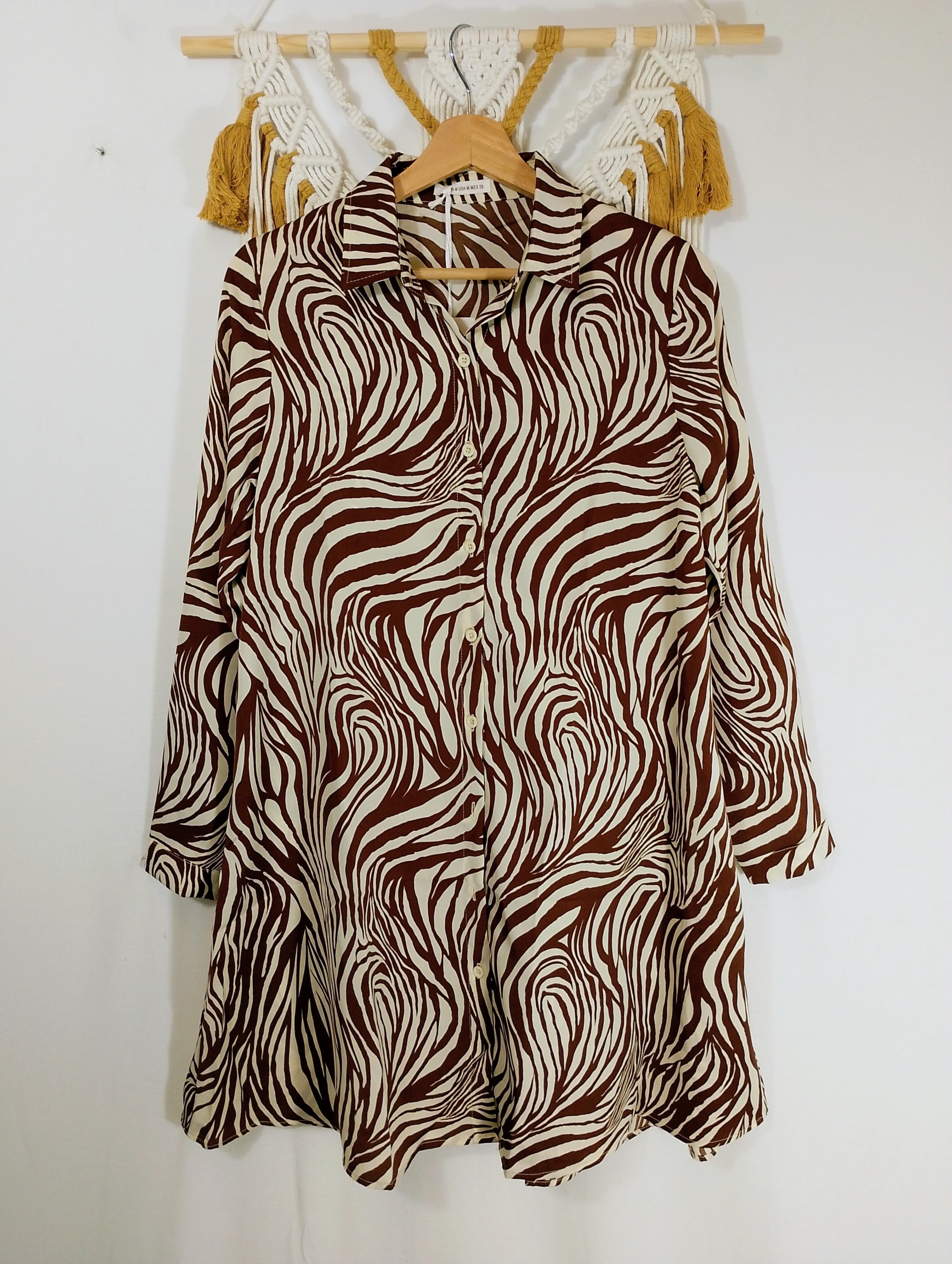 Descubre la esencia del vestido camisero África, la fusión perfecta entre estilo libre y elegancia natural. Este vestido destaca por su diseño bohemio con estampado animal print en tonos marrón y beige, evocando la calidez de la sabana africana. Su corte camisero y fluido realza la silueta sin renunciar a la comodidad, convirtiéndolo en una prenda imprescindible para tu armario.