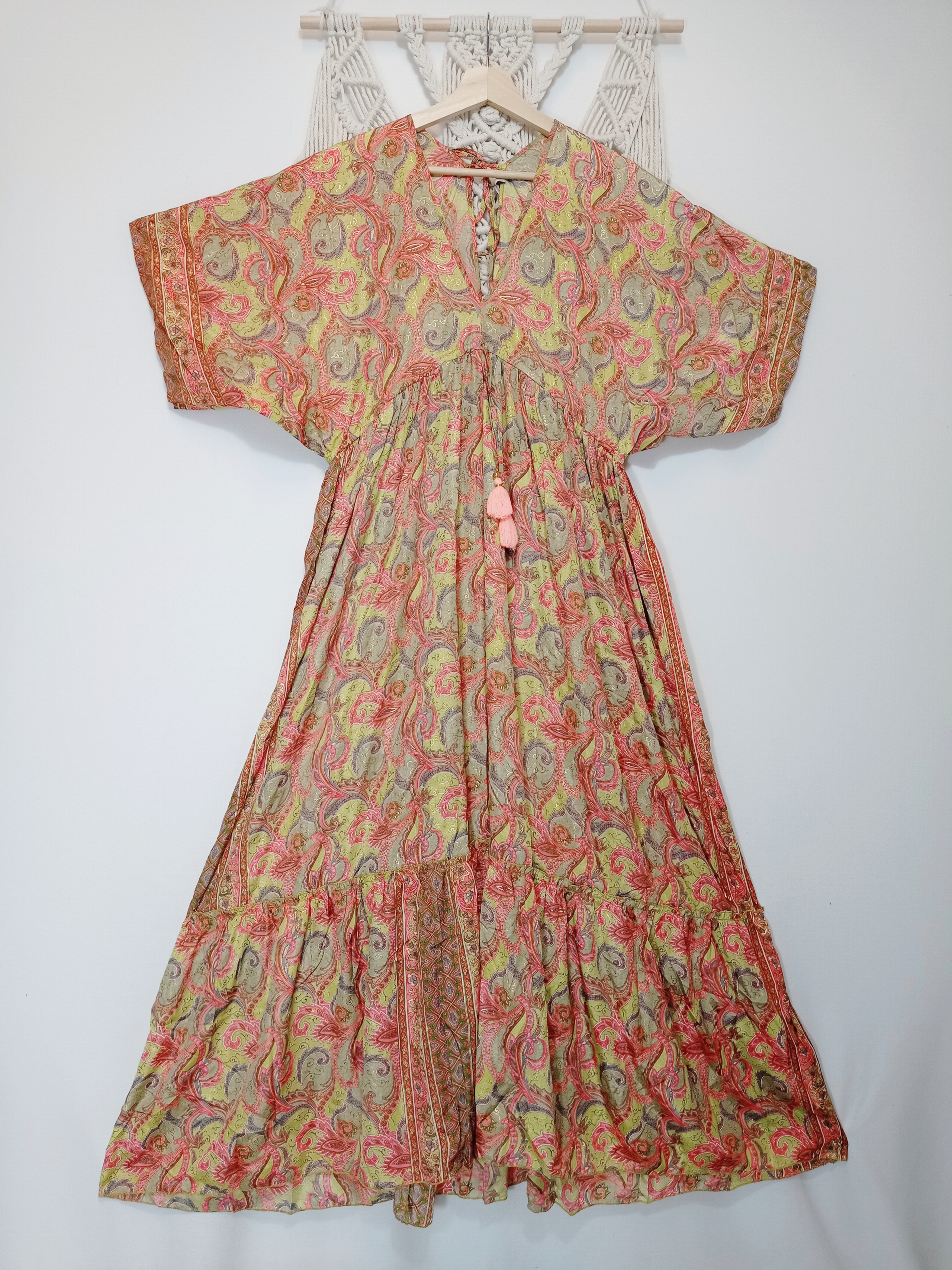 “Ligero, dorado y majestuoso: un vestido de seda boho que brilla con elegancia.”