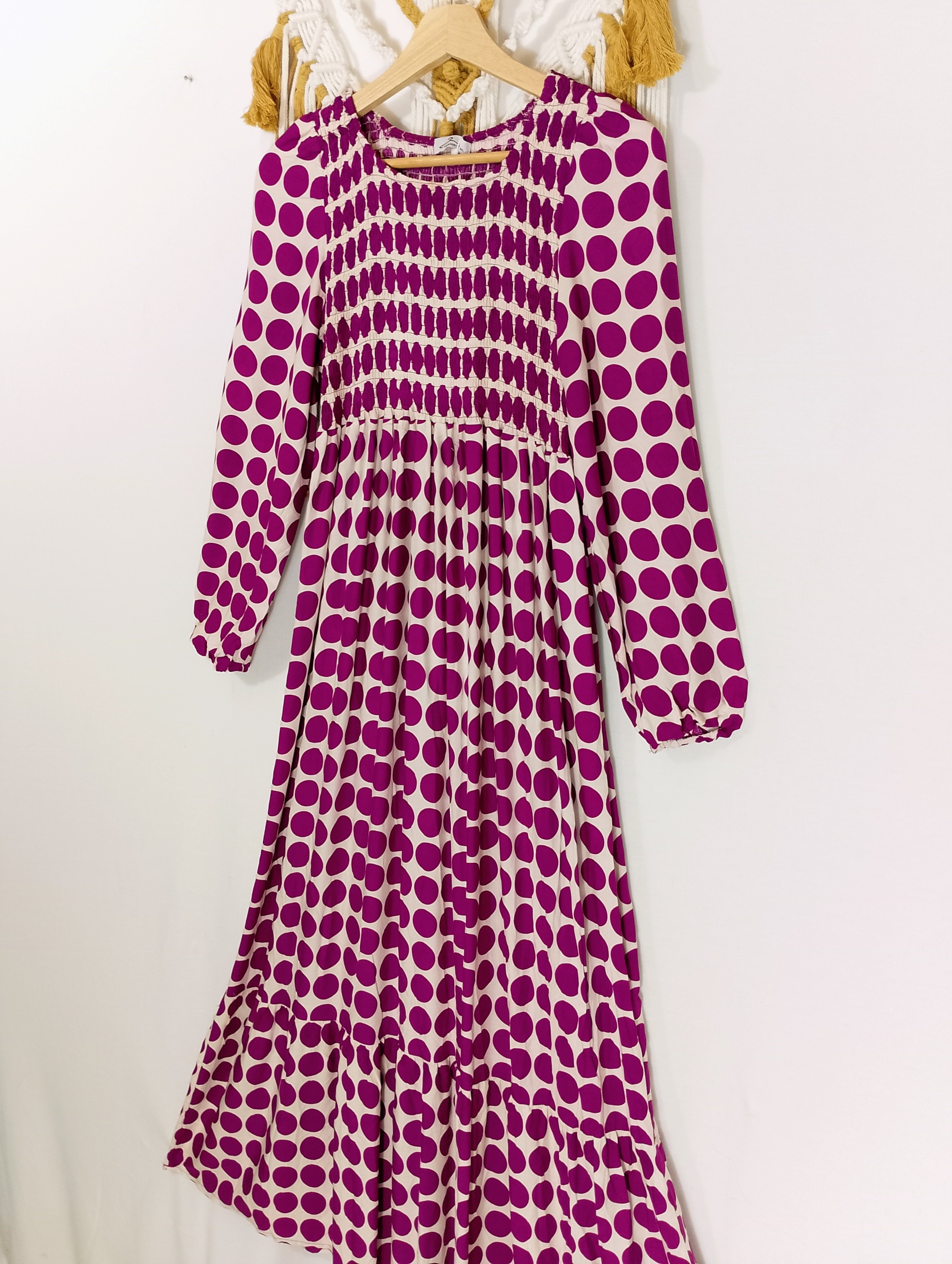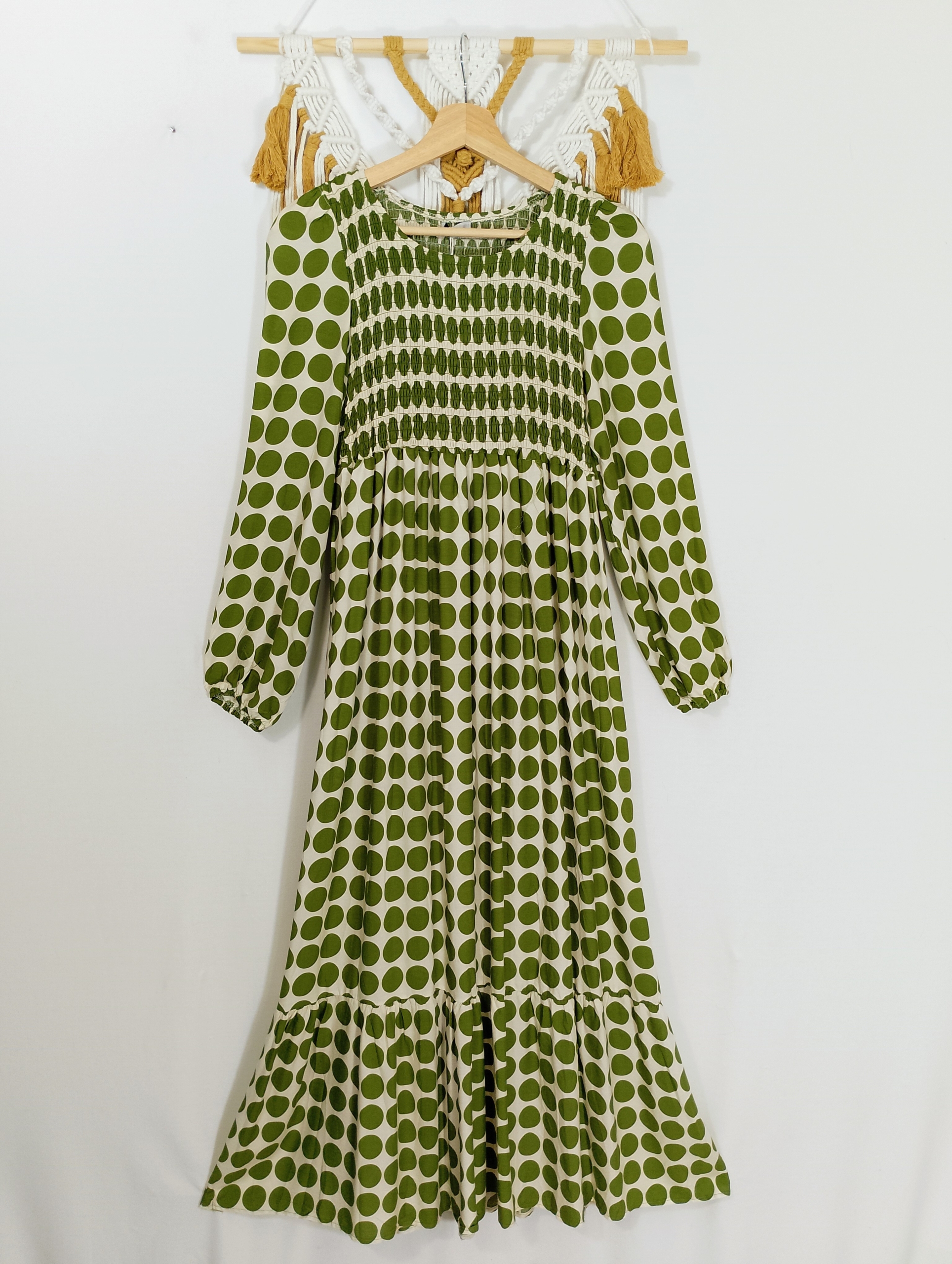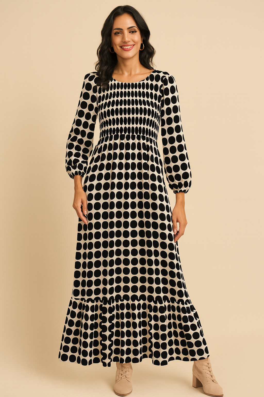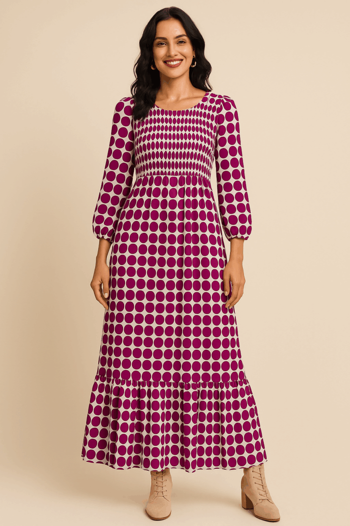 El vestido manga larga Luna es una prenda versátil y con carácter. Su diseño de lunares aporta un toque atemporal y alegre, mientras que su corte fluido y amplio realza la silueta con comodidad y movimiento.